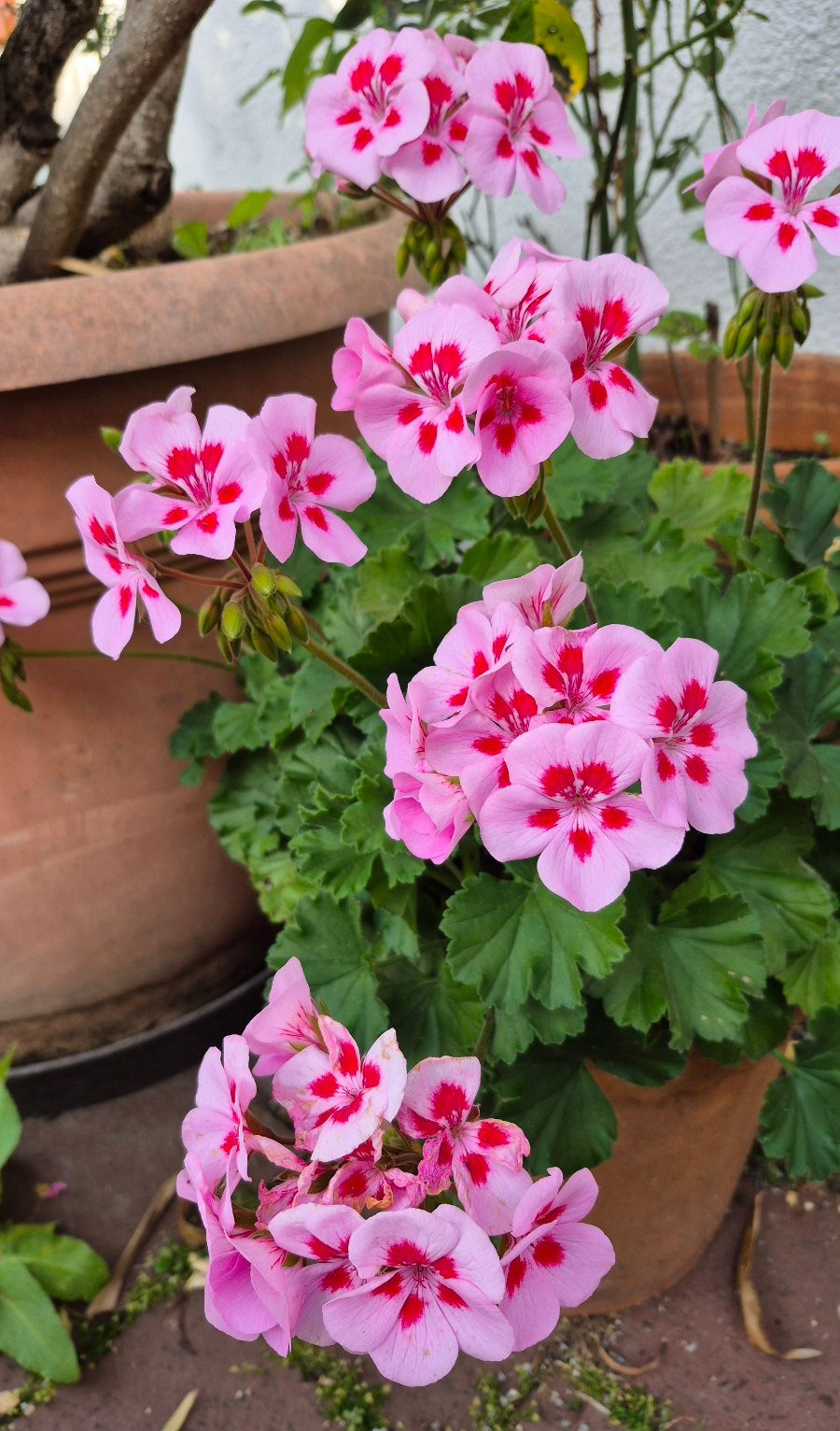 Der gewusel daneben ist ein gelblaubige Zitronenverbene "Golden Wind", mit ein paar Kakteen welche in der Honelia Topf sitzen. Eine Lobelia Hybrid blüht da gerade. Auf der anderen Seite eine Pelargonie "Selma", welche ich zwar wunderschön finde, aber sehr blühfaul ist. Dieses Jahr hat der Kompostdrohung scheinbar gewirkt.