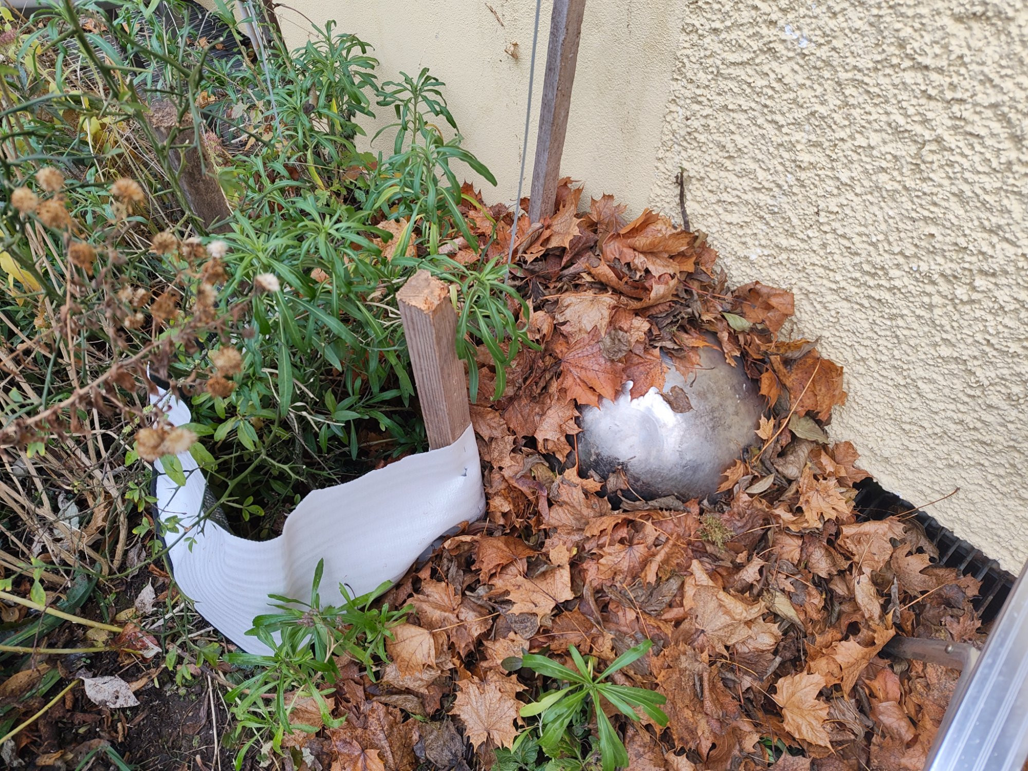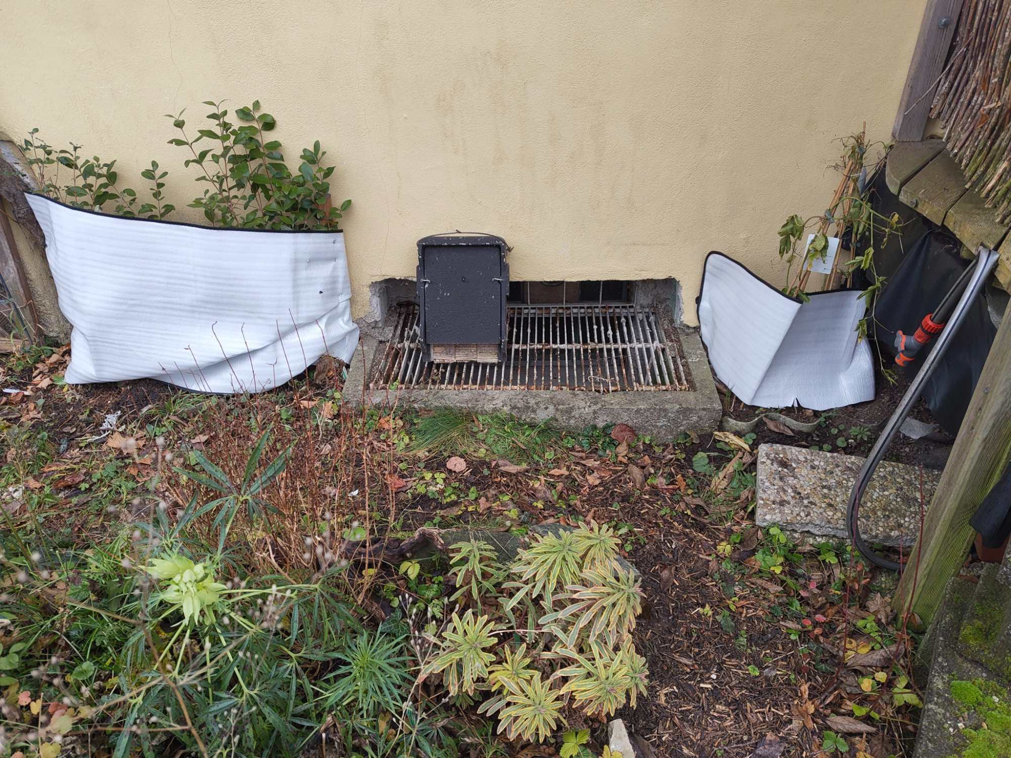 Die Folie soll die vom Haus (trotz Wärmedämmung) abgestrahlte Wärme reflektieren. Und so Passionsfrucht Pflanzen, Erdbeerguaven und die Poncirus schützen. Die direkt an der Hausmauer gesetzte Feige bekam einen alten Küchen-Schneekessel verpasst, der gleichzeitig als Igelhaus dient.