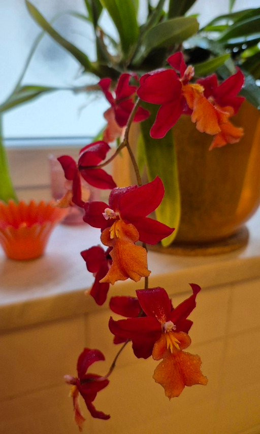 Wegen der kräftigen Blütenfarben, besonders der der Lippe, vermute ich sehr, es ist einer der Klone der x Burrageara 'Stefan Isler' - noch immer eine der dankbarsten Hybriden aus der Oncidium-Gruppe.
