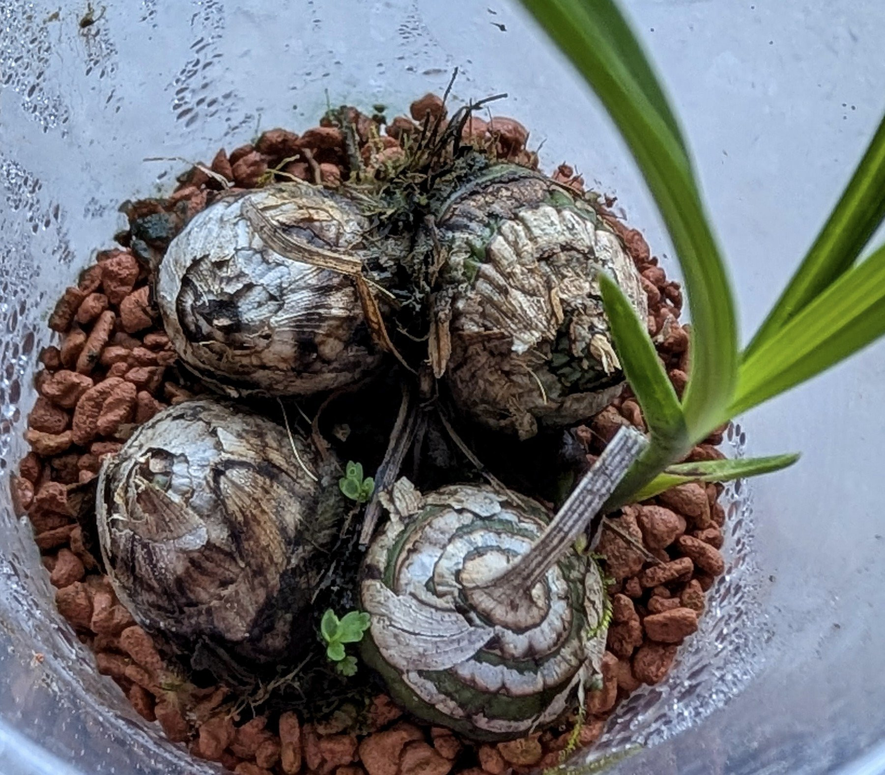 Ich hatte vor einiger Zeit (im Frühjahr?) mein Cymbidium geteilt und euch gefragt, ob es sich lohnt, die blattlosen Bulben zu topfen. Schaut mal, hat funktioniert!