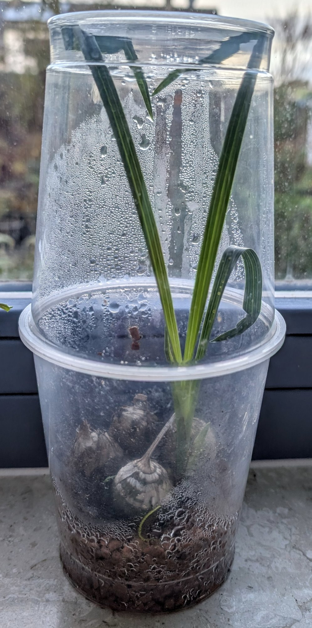 Das Minigewächshaus besteht aus 2 Bechern, in denen bei Globus geschnittene Ananas verkauft wird. Unten drin eine Schicht Seramis, ganz unten immer ein kleines bisschen Wasser. Das Ganze steht auf der Fensterbank an einem Westfenster, mit Heizung drunter.