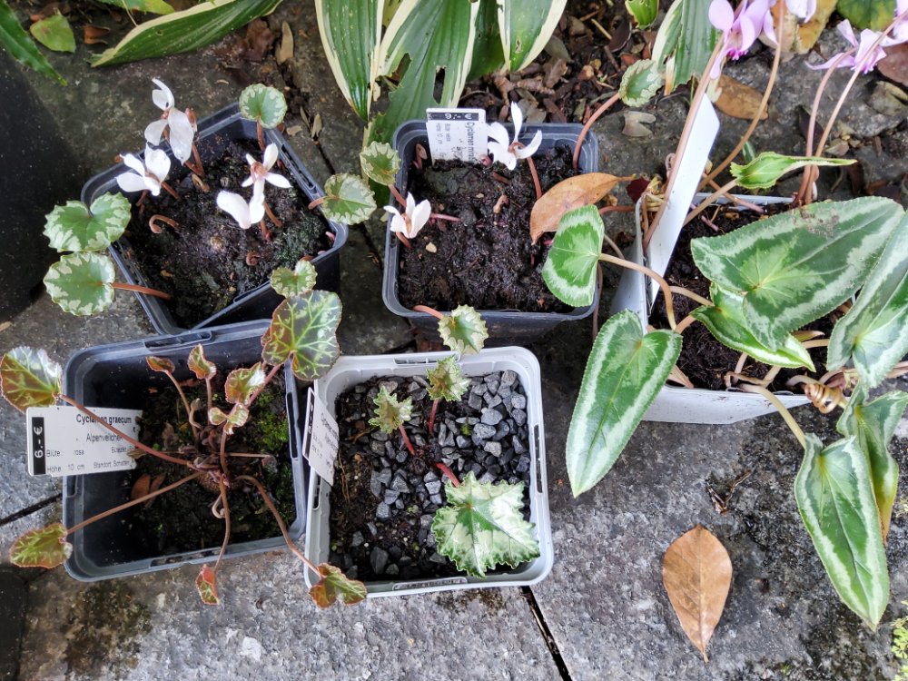 Bei RB gestern - sie meinte, wenn hier C. persicum und C. graecum ausgepflanzt überleben, hat auch C. rohlfsianium gute Chancen. Eines musste also mit und auch noch ein C.g. wegen des schönen Laubs (unten). Dito 2 C. mirabile (oben) - und in der Kiste mit den Special Leaves fand sich eines mit besonders schmalem Laub