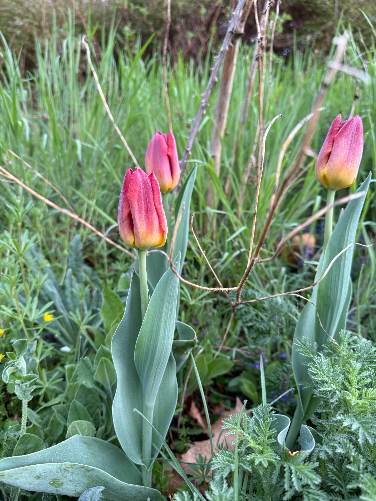 Früher fand ich Tulpen - zumindest die hohen - einfach nur plump. Ich kann immer noch nichts anfangen mit reinen Tulpenbeeten in Parks und botanischen Gärten. Inzwischen finde ich sie aber wunderbar als kleine Gruppen vergesellschaftet mit anderen Frühblühern, Stauden und Gehölzen in gemischten Beeten... am liebsten lilienblütige Tulpen. Die hohen Tulpen haben einfach Fernwirkung. Ich liebe Ton- in Ton-Kombinationen oder auch starke Kontraste - dunkelrot und orange - rosé mit schwarzrot. Rot und gelb gefällt mir nicht, gibt es aber auch an einer Stelle, wo die Vorbesitzer tätig waren.