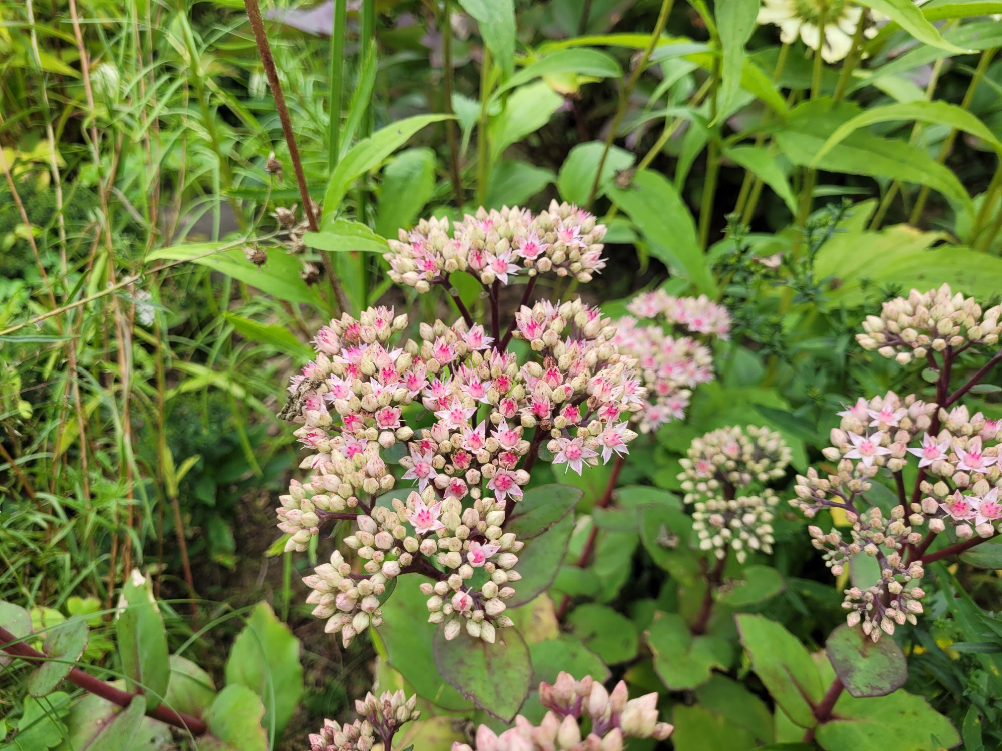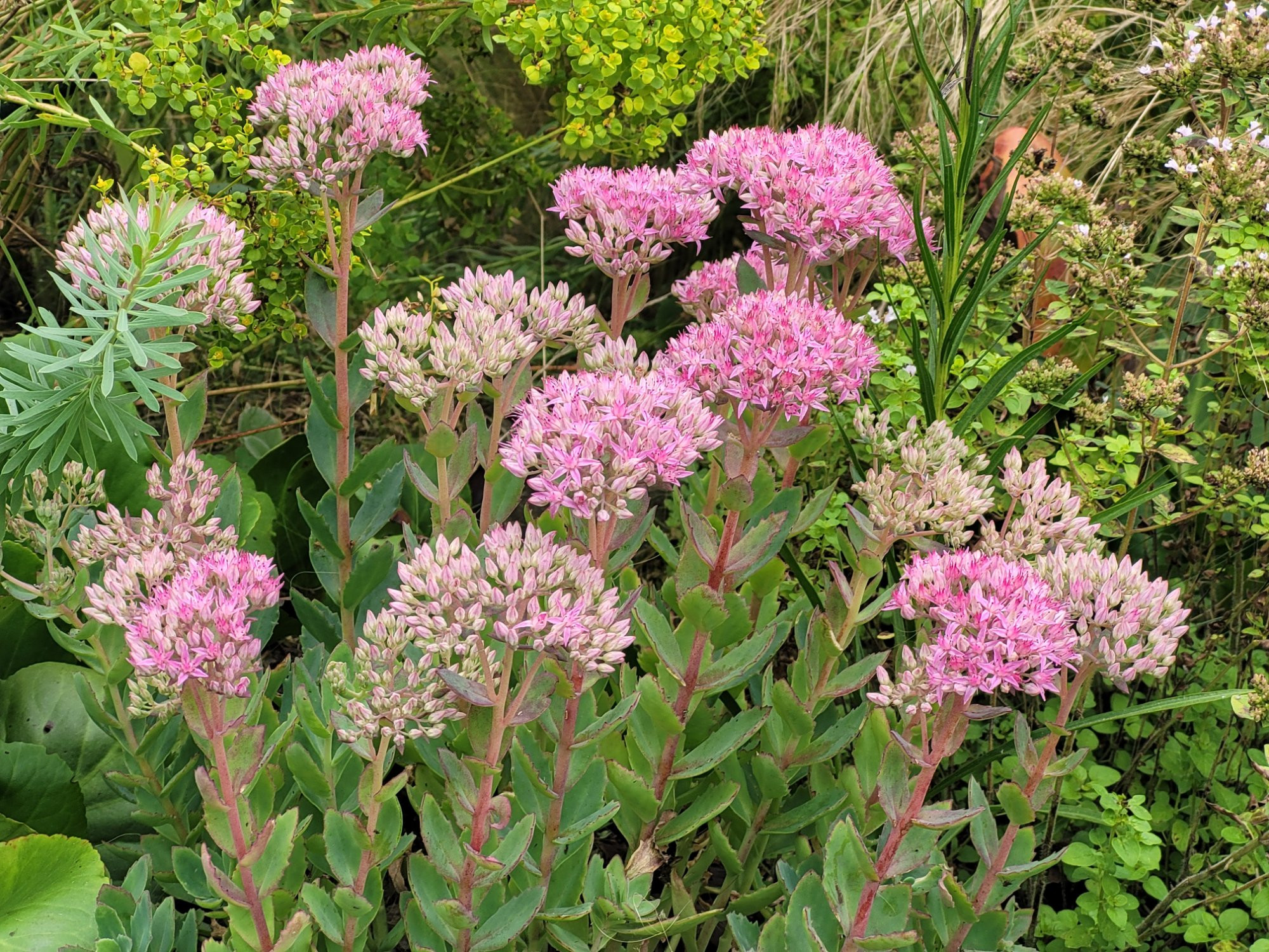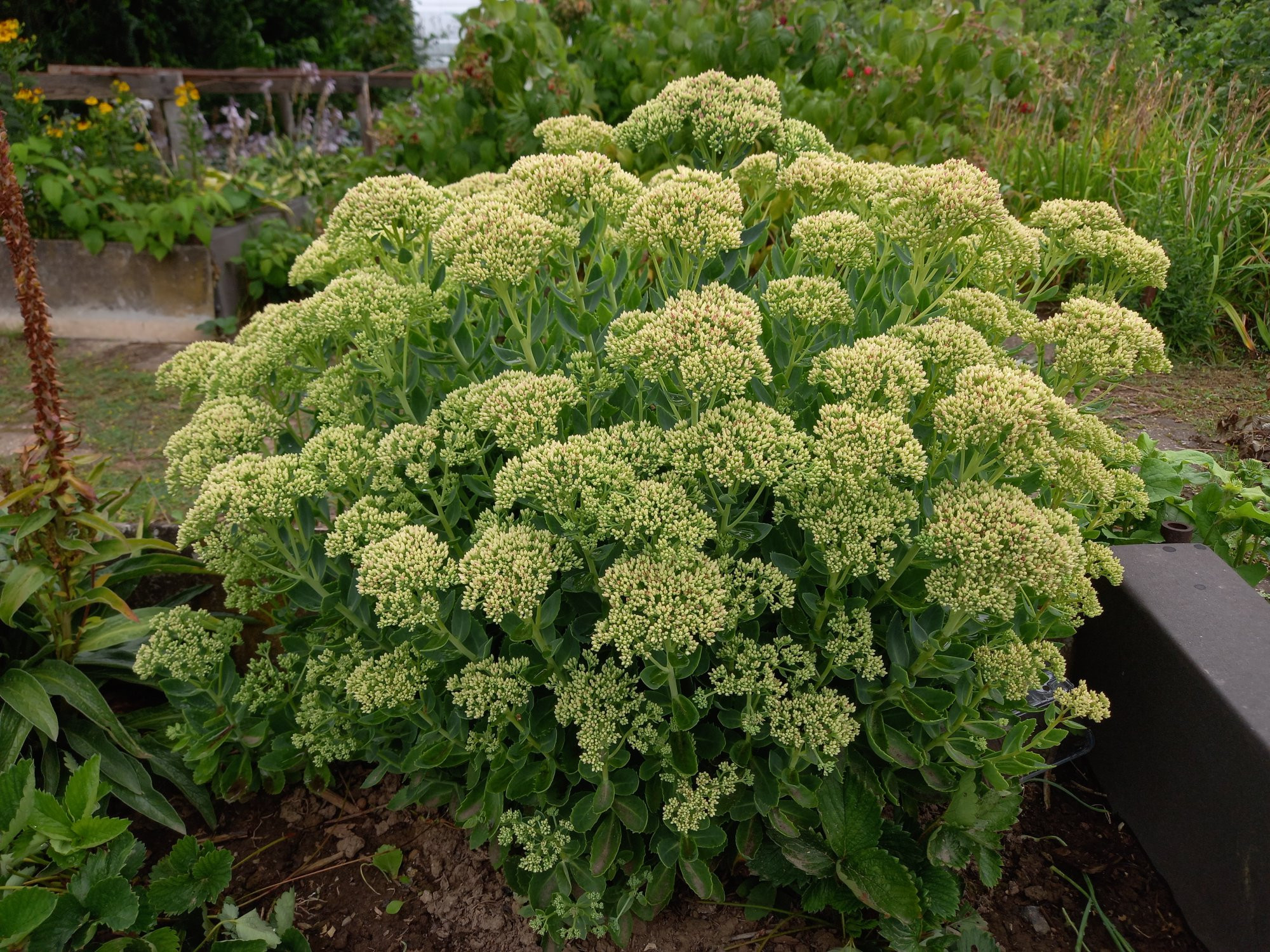 Dank der Trockenheit der vergangenen Wochen sind die Hohen Fetthennen hier weitgehend kompakt geblieben, nur durch die Regenfälle der letzten zwei Wochen sind sie dann nochmal in die Breite gegangen, größtenteils sind sie aber immer noch standfest. Hier ein paar Exemplare im Vorgarten, so soll das sein.