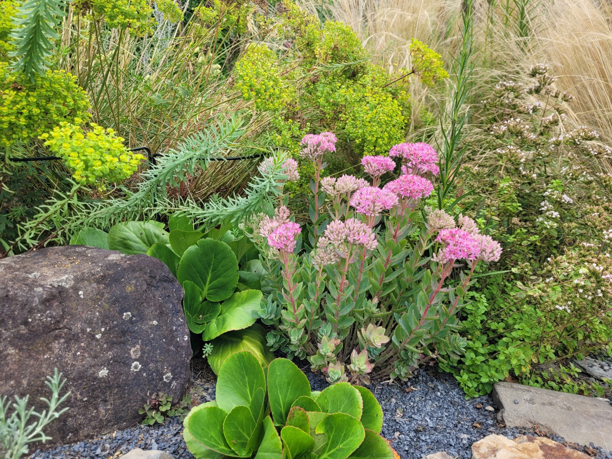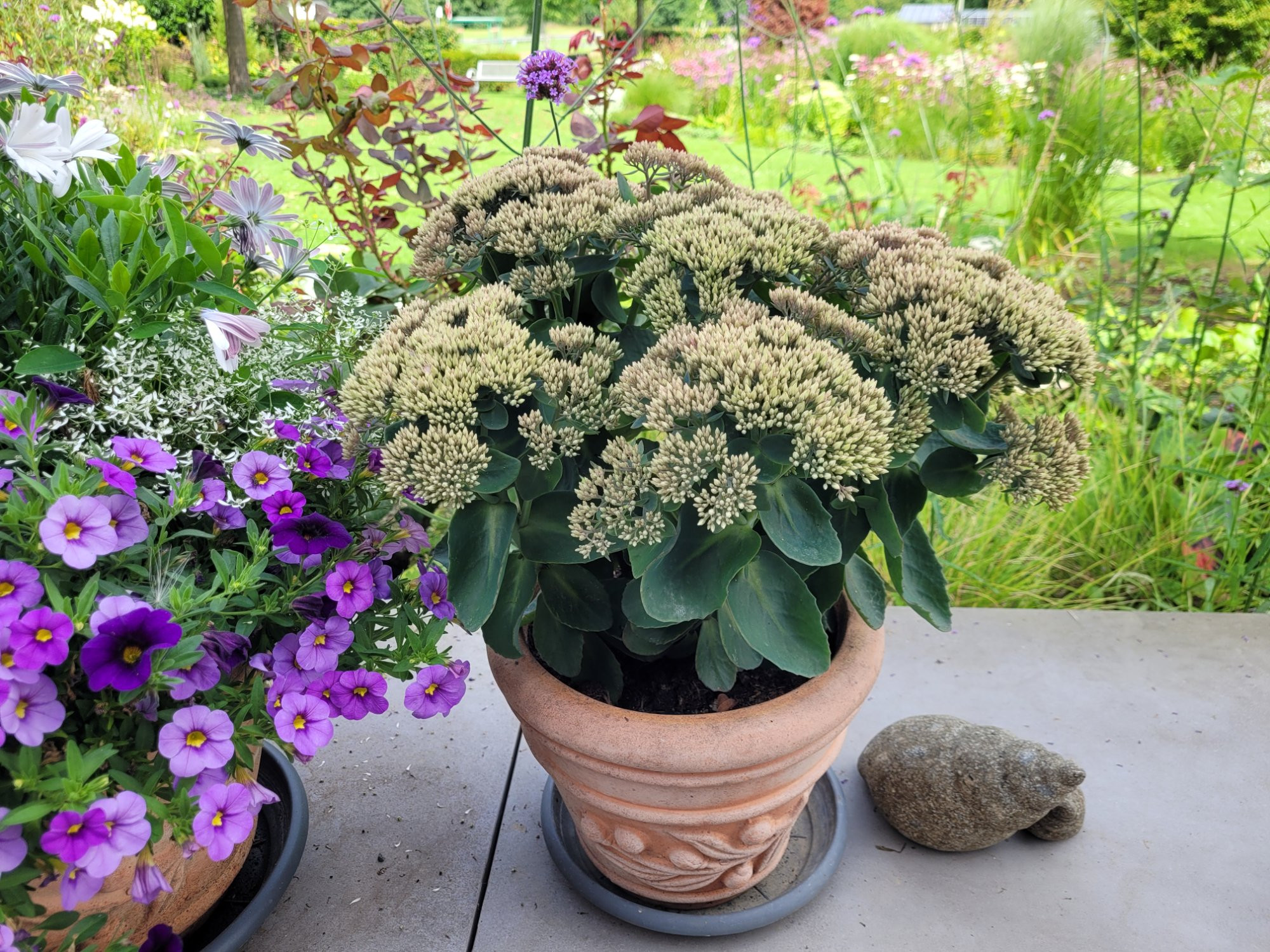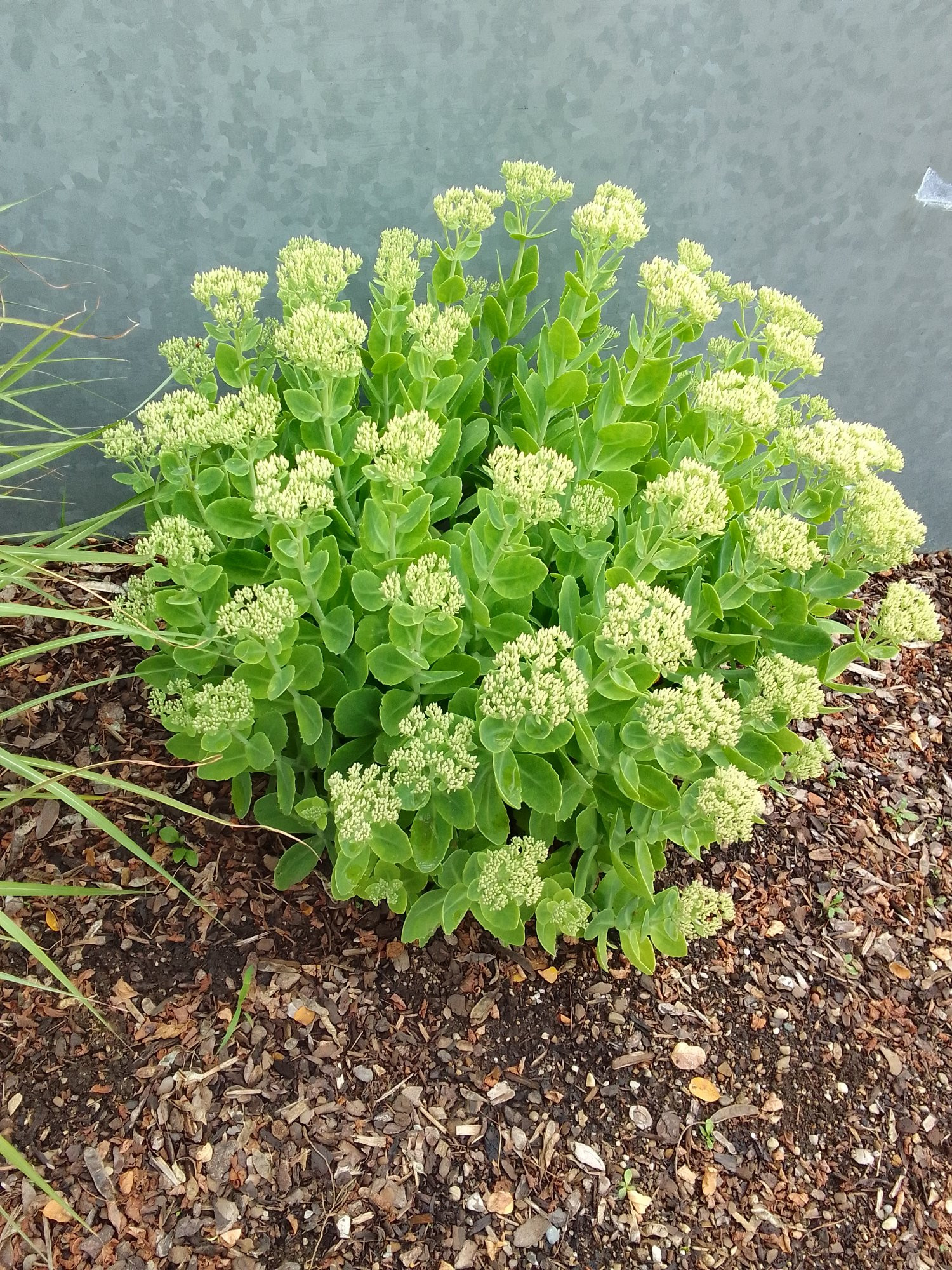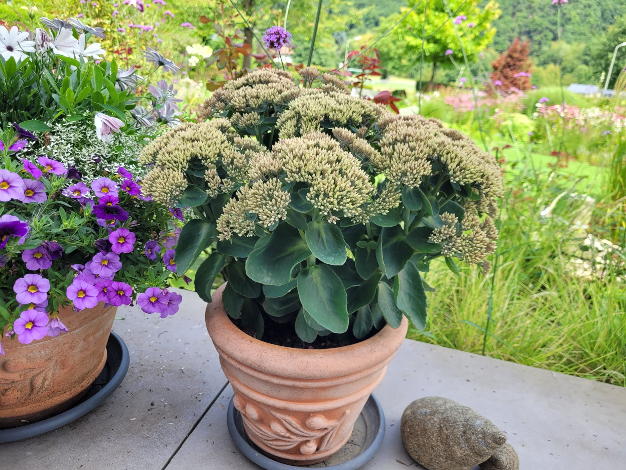 Dank der Trockenheit der vergangenen Wochen sind die Hohen Fetthennen hier weitgehend kompakt geblieben, nur durch die Regenfälle der letzten zwei Wochen sind sie dann nochmal in die Breite gegangen, größtenteils sind sie aber immer noch standfest. Hier ein paar Exemplare im Vorgarten, so soll das sein.