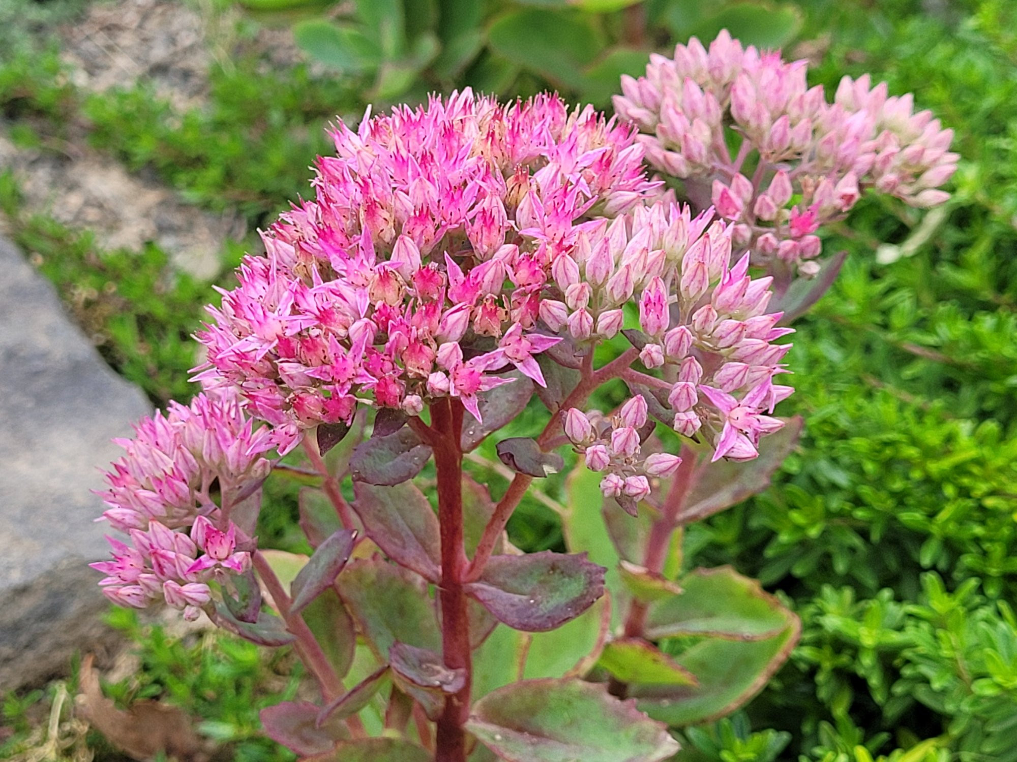 Sedum "Herbstfreude" mit Chelsea Chop, halb so hoch wie die ungeschnittene Staude, zierlichere Blütenansätze