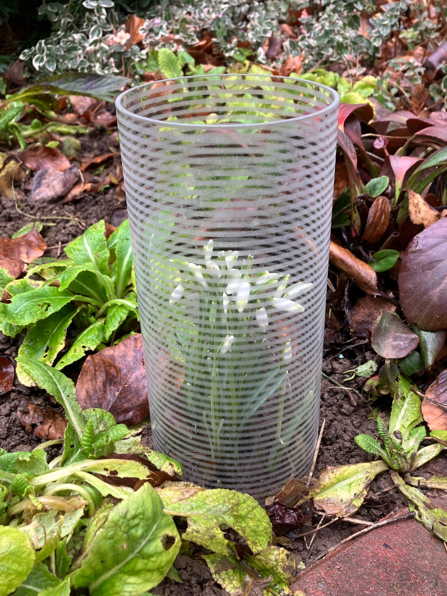 Ikea-Lösung 2.Wahl, die andere Laterne brauche ich innen. Das Opferglöckchen ‚Cornwood‘ war schon wieder etwas angeknabbert, Pflanzenglocken dummerweise nicht hier vor Ort. Nicht top, aber doch etwas besser geschützt. ( Keine gelochte Frischhaltefolie übergestülpt wegen der Optik.