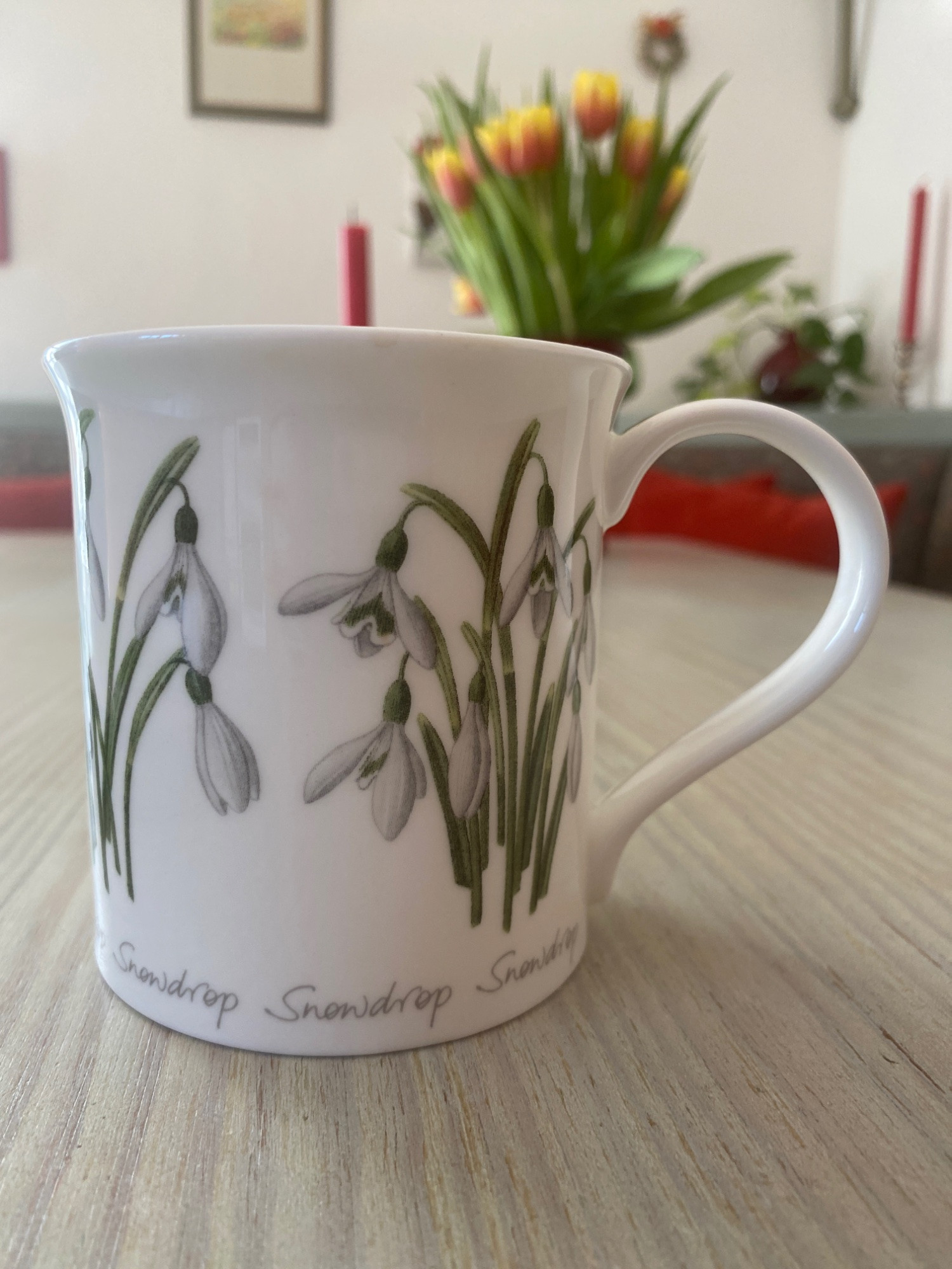 Ein bisschen OT: wenn ich mir die echten Schneeglöckchen im Garten noch nicht anschauen kann, dann wenigstens die auf meiner Kaffeetasse.
