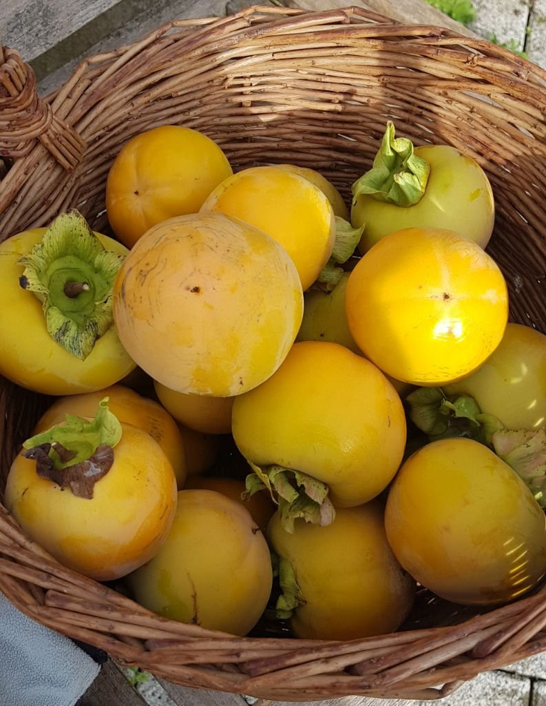 Jetzt sind sehr viele noch nicht reife Kakis dran. Heute habe ich einen Korb von den reifsten geerntet, dann bekommen die restlichen hoffentlich noch ein bisschen mehr Süße.