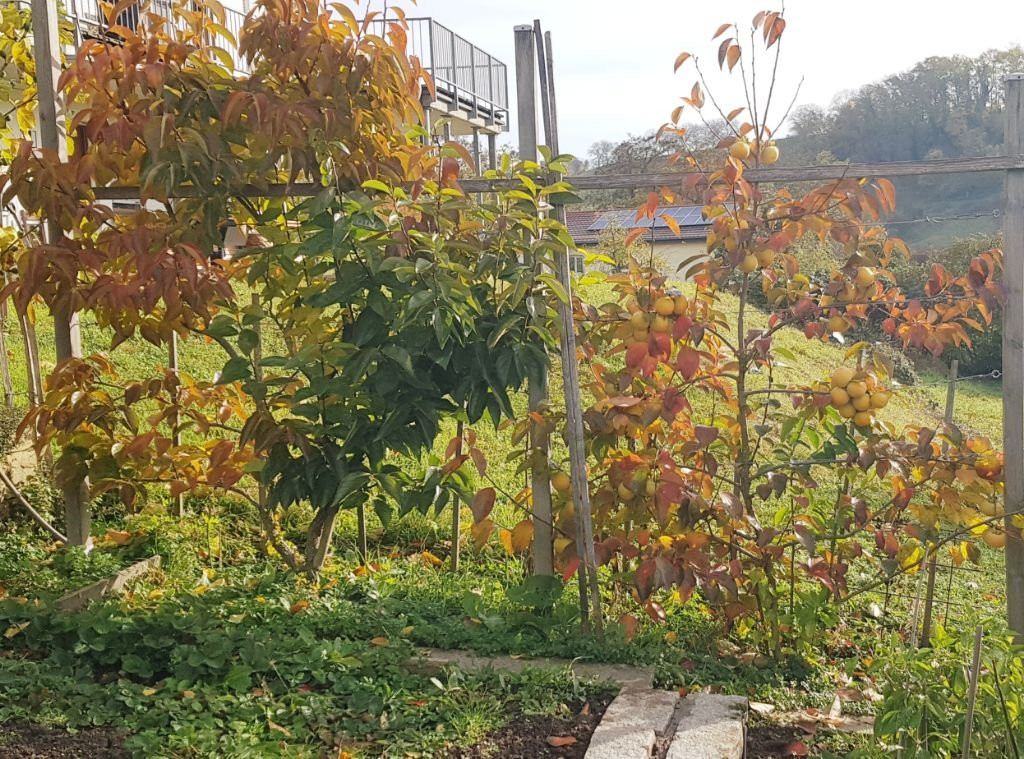 Kaki Pendula: 20cm von der Hauswand, auch süß mit Kernen. Gut mit interessantem Aroma.