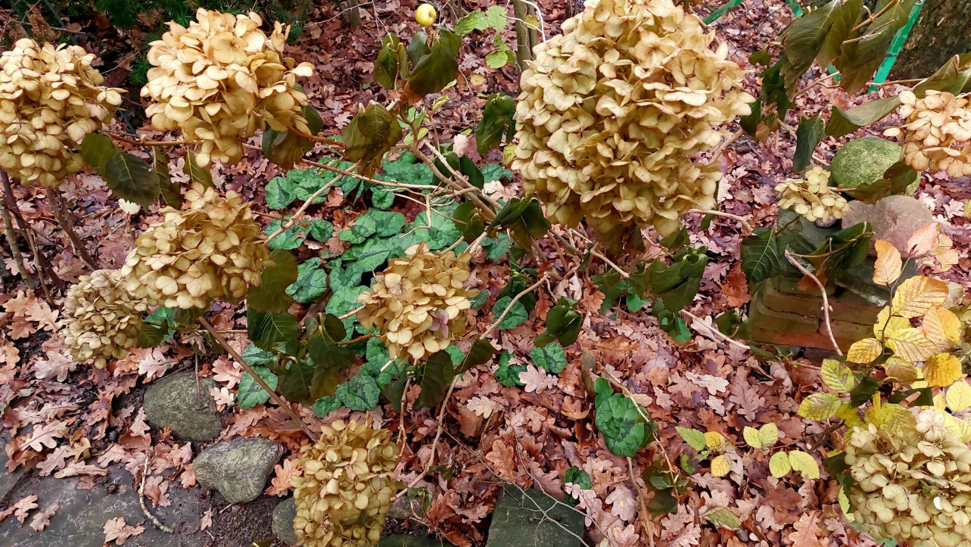 Eindrücke zwischen Herbst und Winter : was von den Herbstanemonen übrig ist, Herbstlaub von Gingko und Walnuß, erster Raureif und