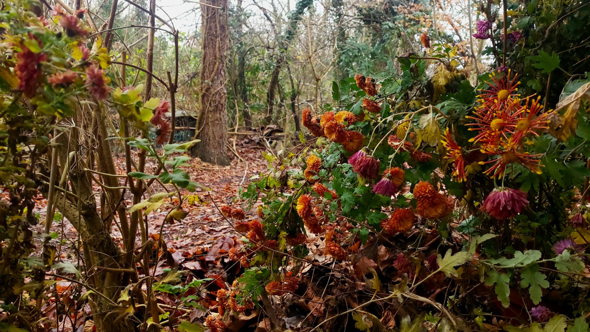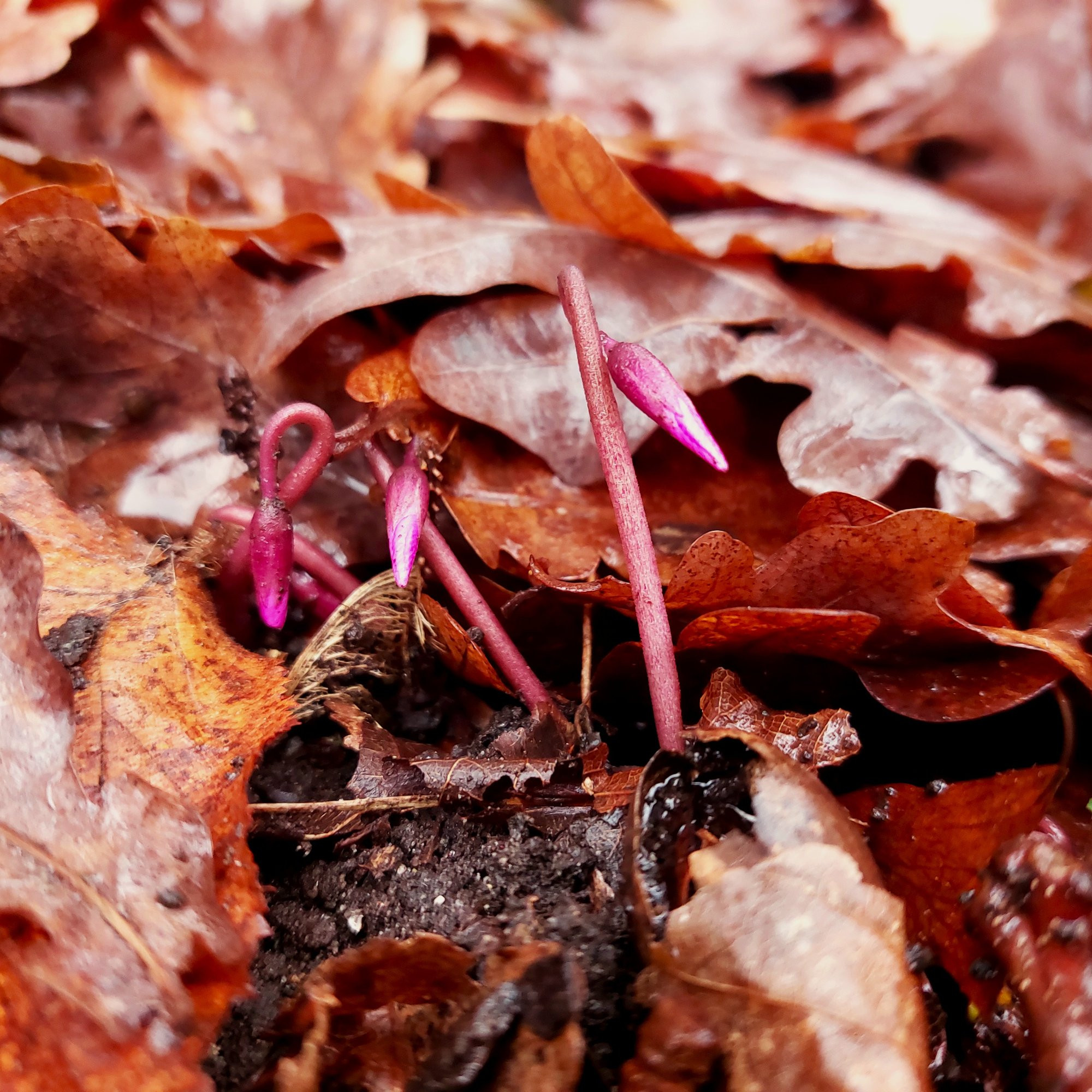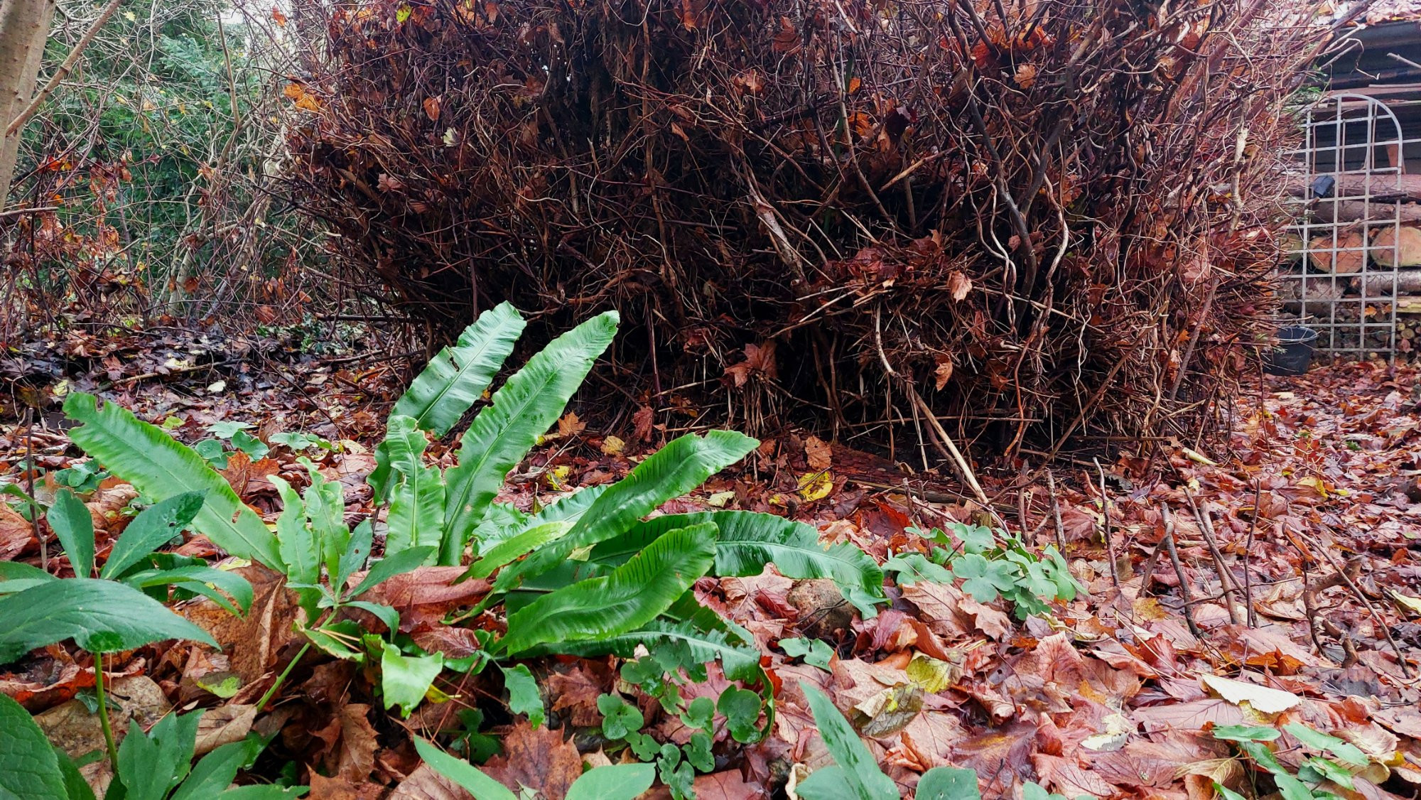 Novemberwetter im Dezember. Cyclamen coum zeigt erste Knospen, die Chrysanthemen ihre letzte Blüten, die wintergrünen Farne , hier Hirschzungenfarn , stehlen dem Weihnachtsbaum die Schau ( noch ).