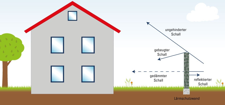 Was ich nicht verstehe, ist, warum die Mauer 4-6 m hoch sein soll. Der Schall breitet sich ja wellenförmig aus, d.h. er fliegt nicht um die Kurve. Die Straße ist in unmittelbarer Nähe, d.h. von dem schallerzeugenden Objekt (Auto), breitet der Schall sich in einer Linie aus und wird von der Mauer reflektiert oder gedämpft.