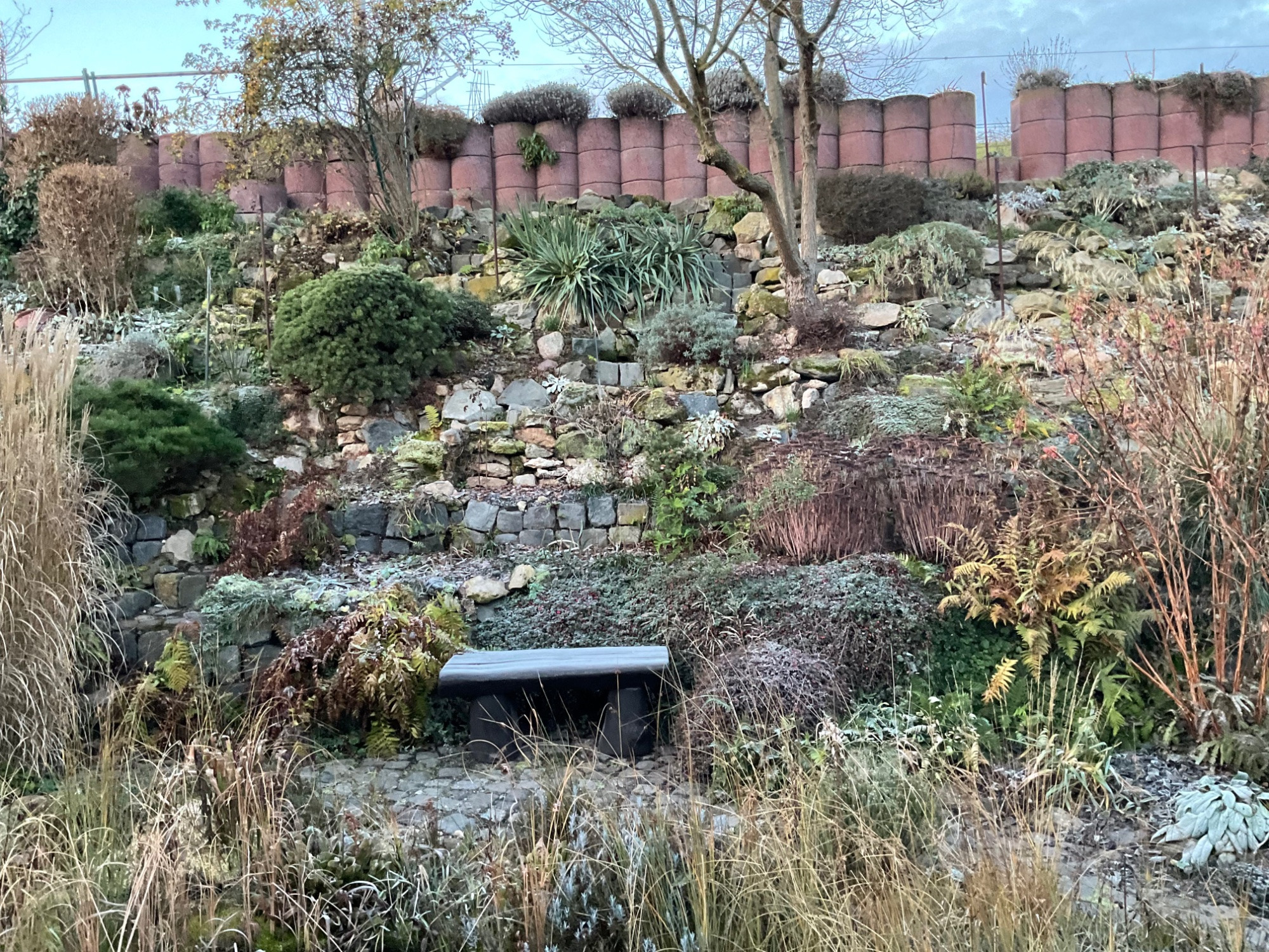 Macht sich gut zusammen mit den Bergenien und den wintergrünen Gräsern.