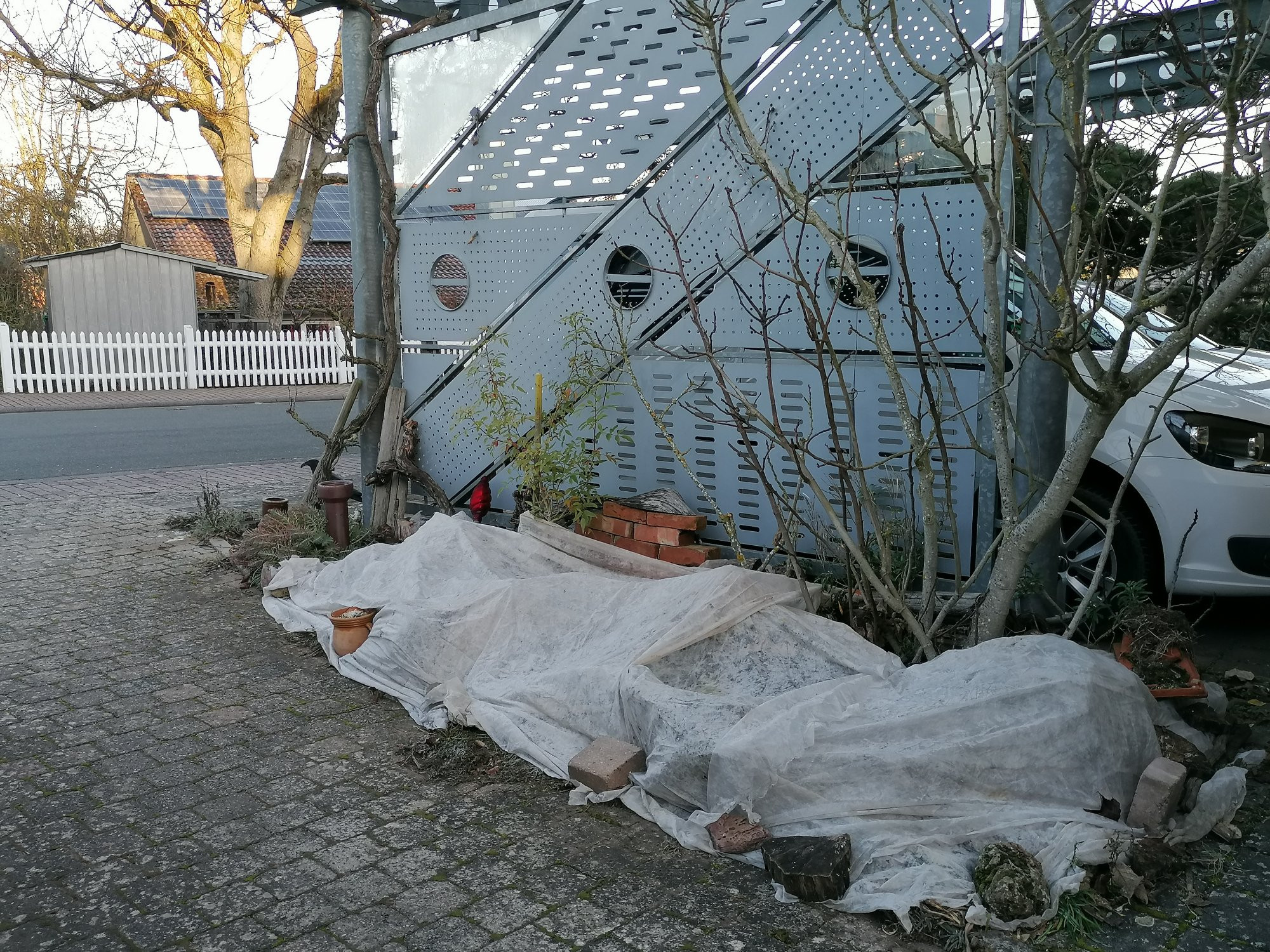 Nicht aufwändig, einfach Vlies drüber und am Rand mit Steinen beschwert. War eine Weihnachtsbeschäftigung