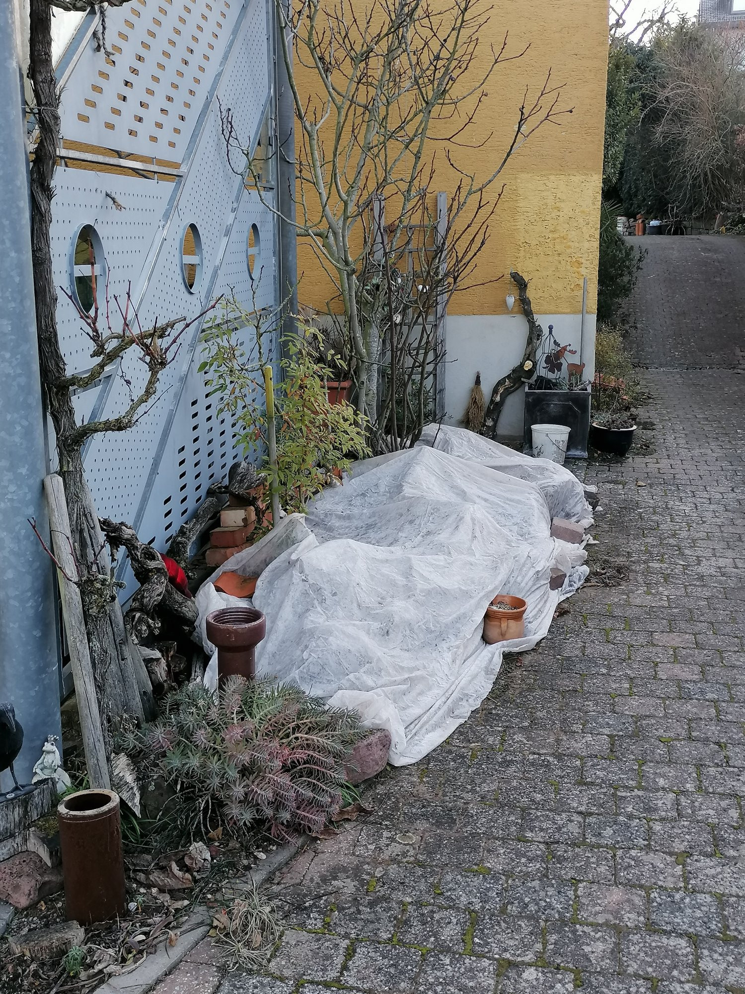 Früher hab ich viel abgedeckt, aber das war mir dann zuviel Aufwand. Jetzt sind die empfindlichsten Sachen in diesem Beet zusammengefasst,u.a. eine im Sommer geteilte Chamaerops cerifera.