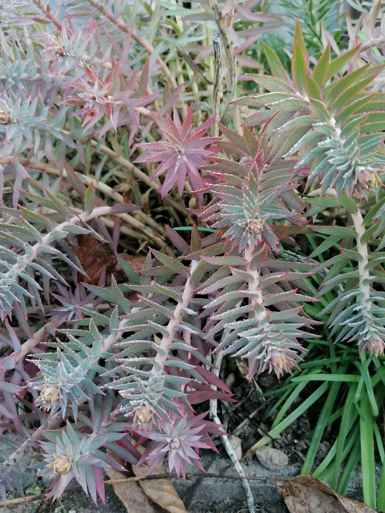 Euphorbia rigida hat ihre rosa Winterfarbe und beginnt mit ersten Blüten