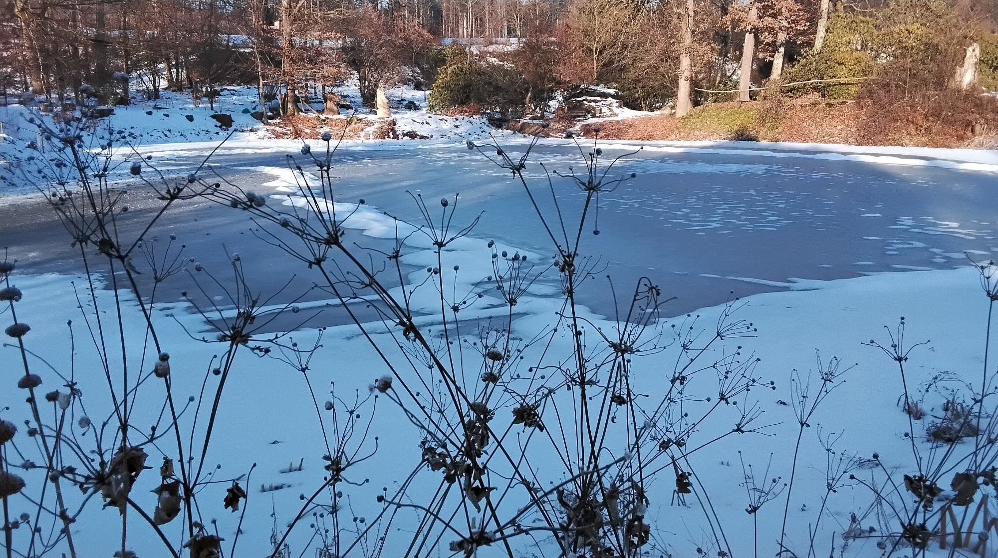 Ein paar Fotos von mit Eis und Schnee eingehüllten Garten. Seit drei Wochen immer unter Null Grad und Tiefstwerte bis minus 15 Grad. Gut dass da eine Schneedecke über meine Zimperlinge liegt.