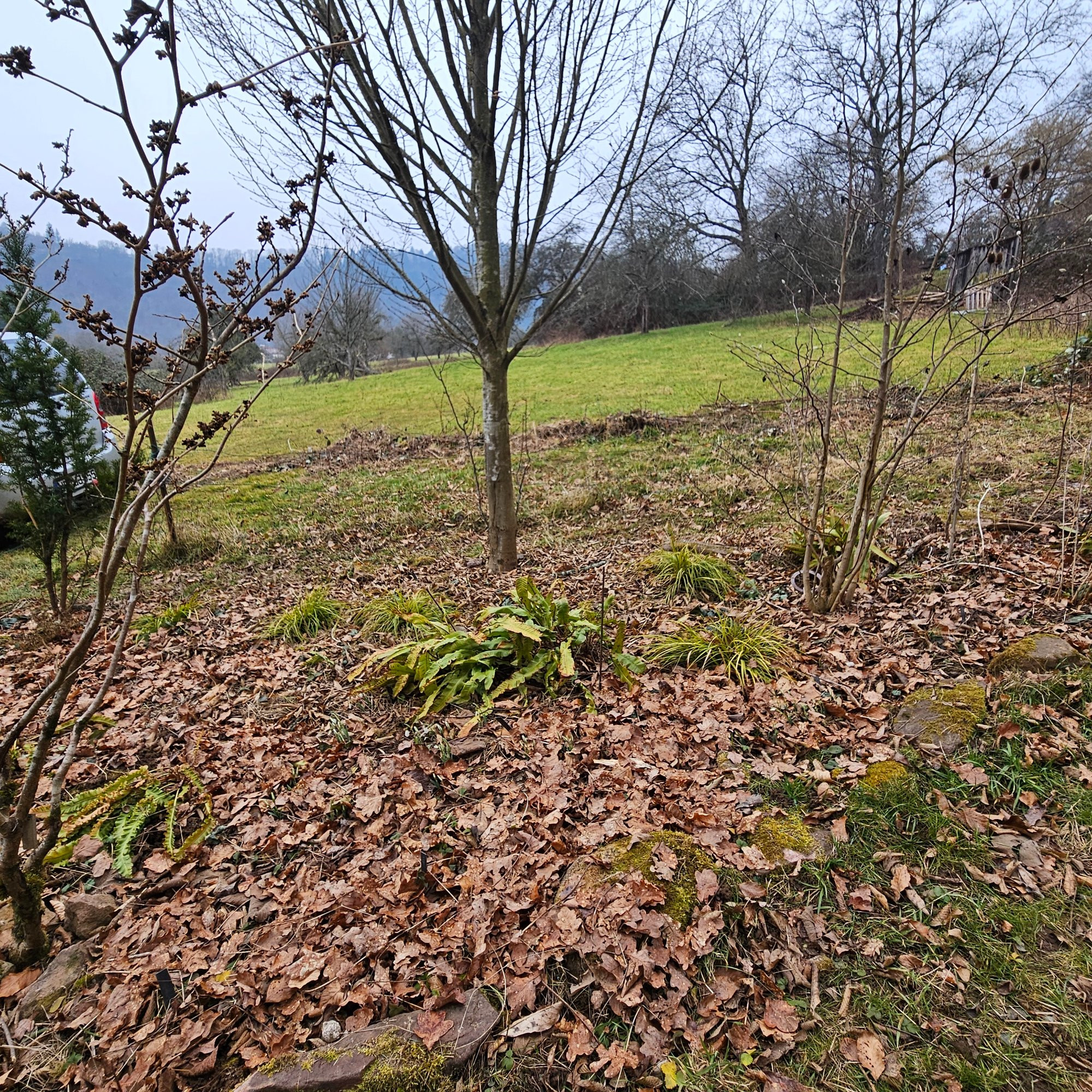 Übersicht über den waldigen Teil. Vorne die Ulme, links im Bild Hamamelis, Eibe und dann Säulen-Hainbuche umgeben von Hirschzungenfarnen.