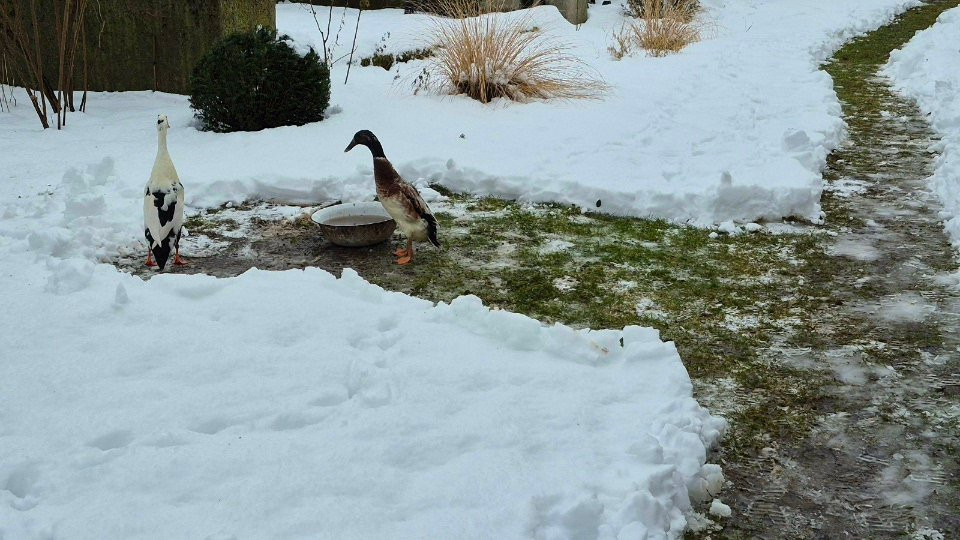 Endlich wieder Plusgrade, die Enten mussten dringend mal raus. Auf den geschippten Flächen ist es nachmittags ganz gut weggetaut, endlich wieder grünes Gras!