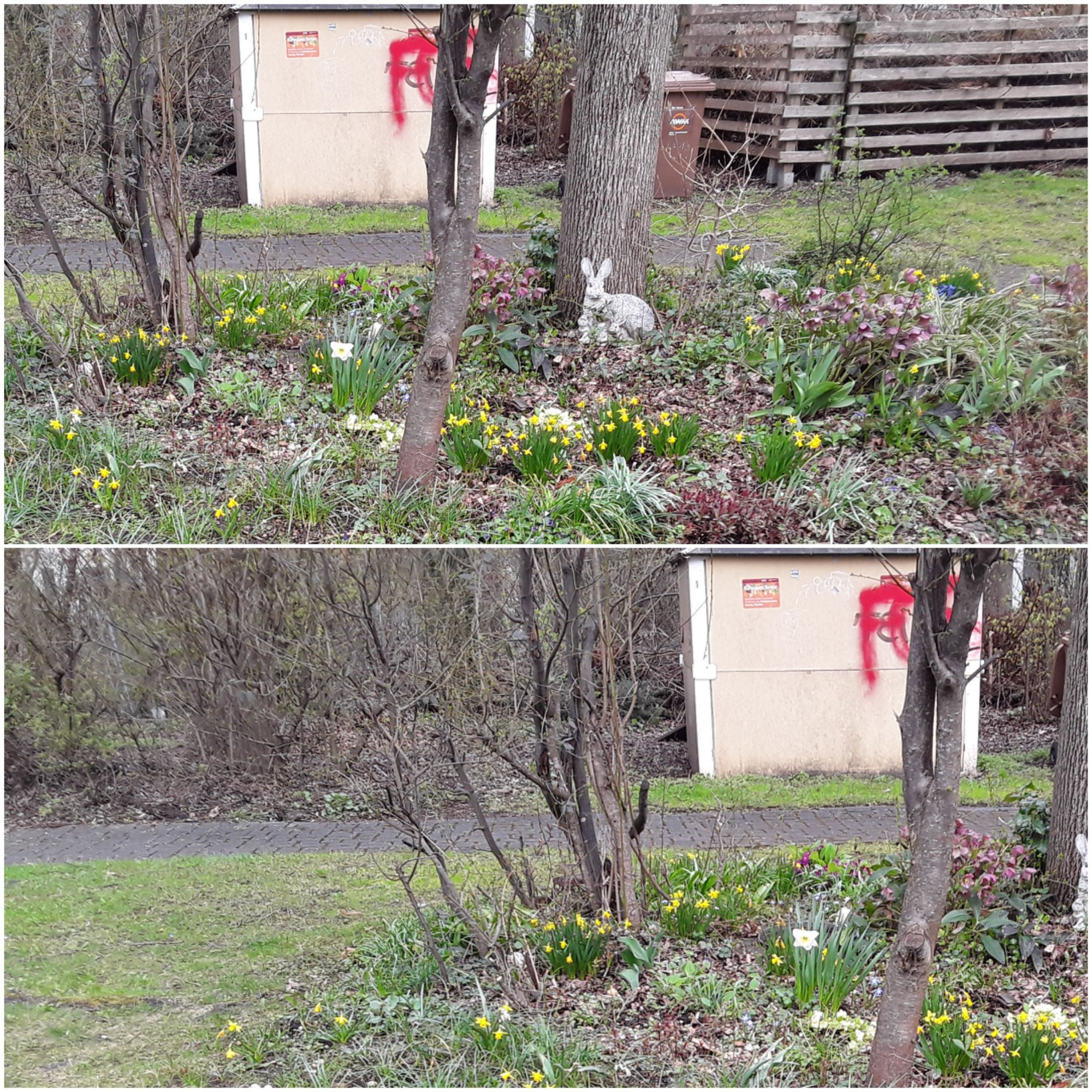 "Schmuddelecke" wäre die menschliche Sicht der Dinge - "Luxuswohnanlage" die deiner vielfältigen Gartenfauna. So viel Platz für Laub und Grünschnitt ist toll. Wir " "zwängen" das meiste Grünzeug, das so anfällt, in eine eingefasste Kompostanlage, haben aber einige freie Kompostecken ( zumeist Laub, wie bei dir , Hans-Herbert) im Garten verteilt.