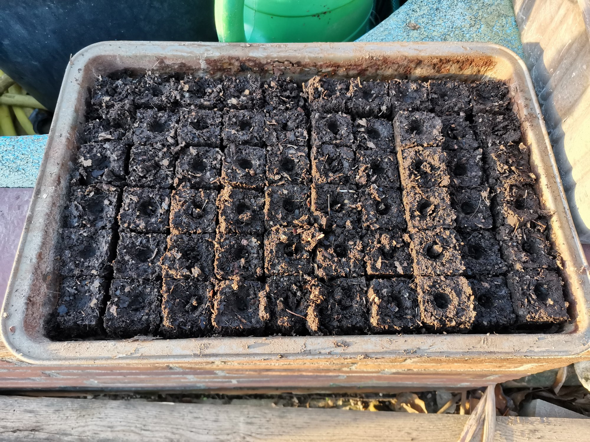 Presstöpfe mit Laubkompost. In dem Versetzungsstadium leider nicht stabil genug, auch wenn von unten gewässert wird.