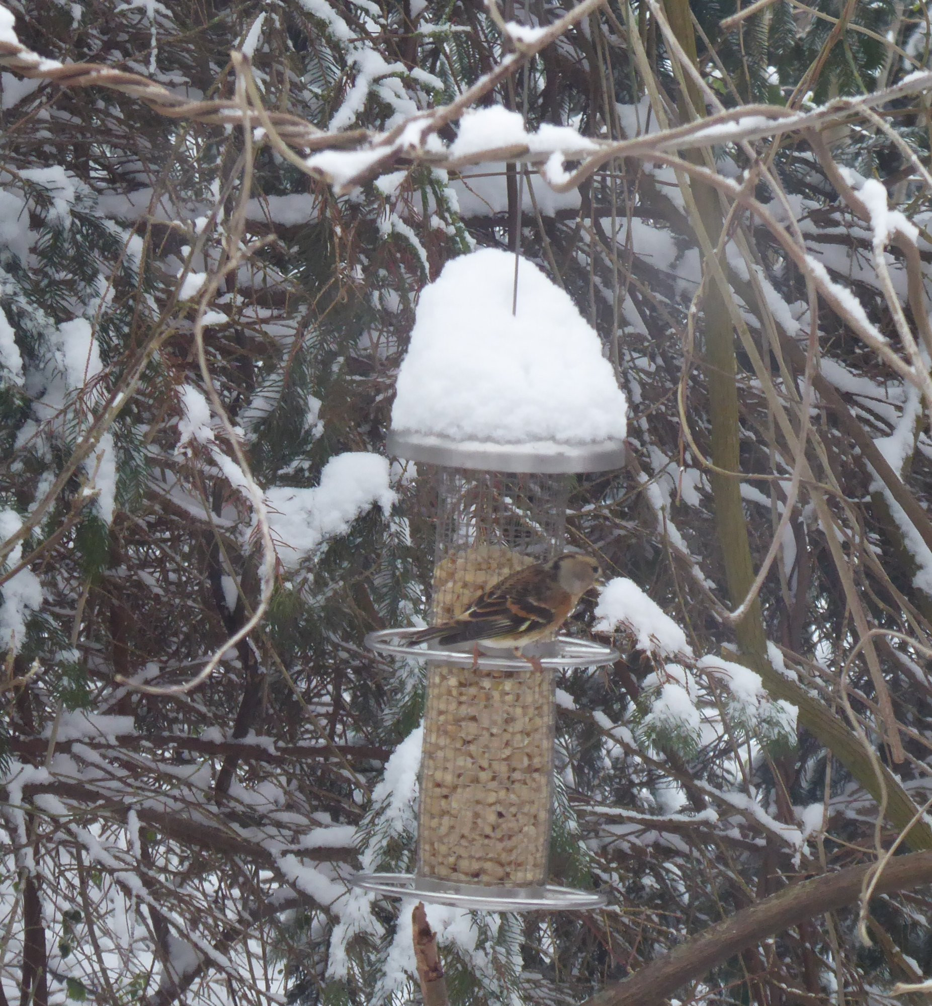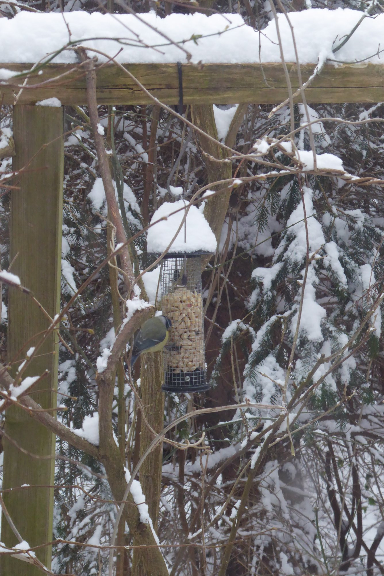 Neuschnee über Nacht. Obwohl es nur leichten Frost hat, ist an den Futterspendern Hochbetrieb. Durch's Fensterglas fotografiert, darum wirkt alles so matt. Die Vogelbande hier ist Menschen nicht gewohnt und sobald sie einen sehen, sind alle weg.