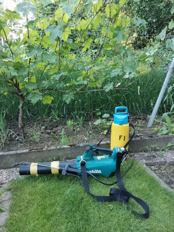 Motorrückenspritze war gestern bzw ist mir zu teuer, deshalb Eigenbau mit verstellbarem Laubbläser.