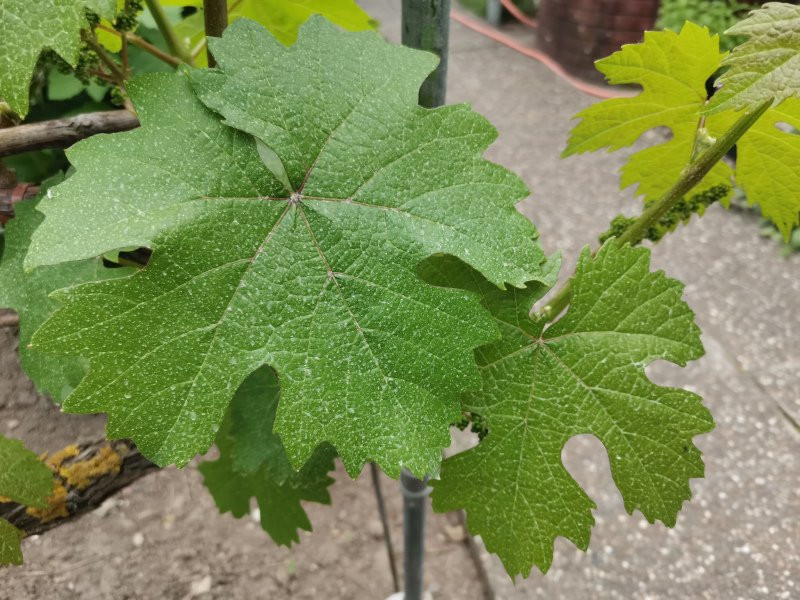Mit ein bisschen Übung bekommt man das perfekte Spritzbild hin (hier Schwefel, den sieht man gut). Es dürfen keine Tropfen auf dem Blatt zusammenlaufen. Nicht vergessen, die Applikationsqualität macht 30-40% der Wirkung aus.
