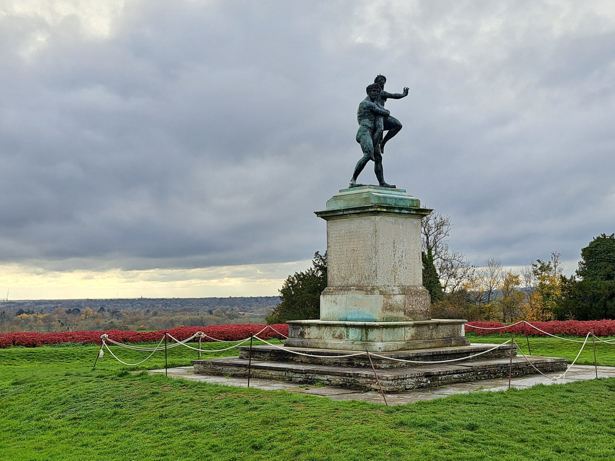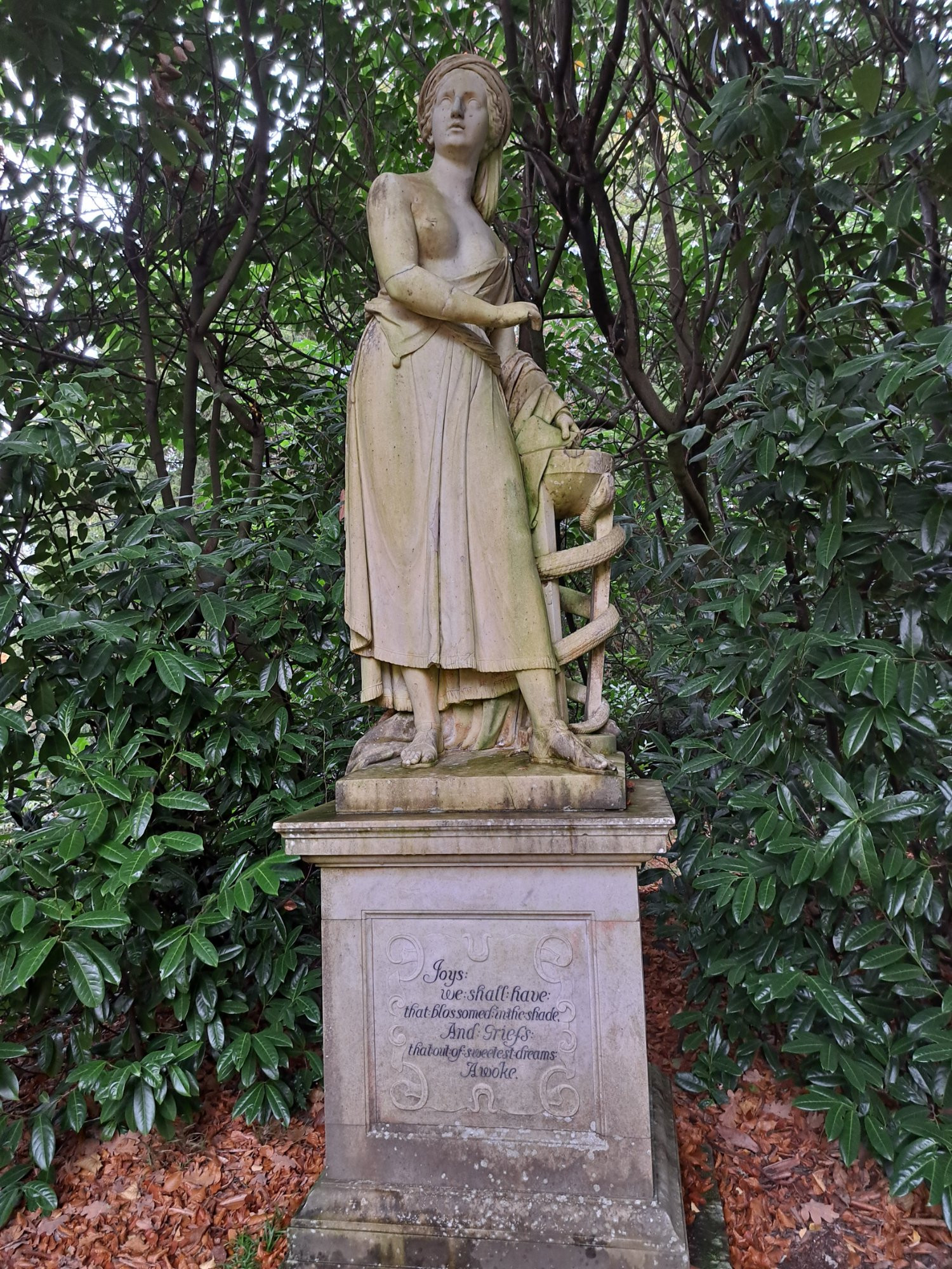 Blick über genau dieses Theater und die Gegend hinter River Thames: Dort, im nördlichsten Eckchen des Garten stand diese Dame: Mit Spruch im Podest: