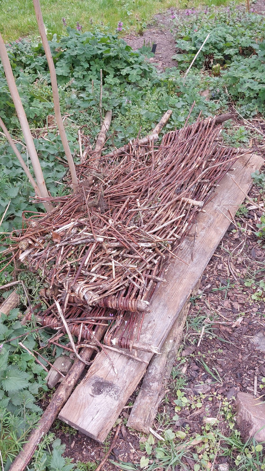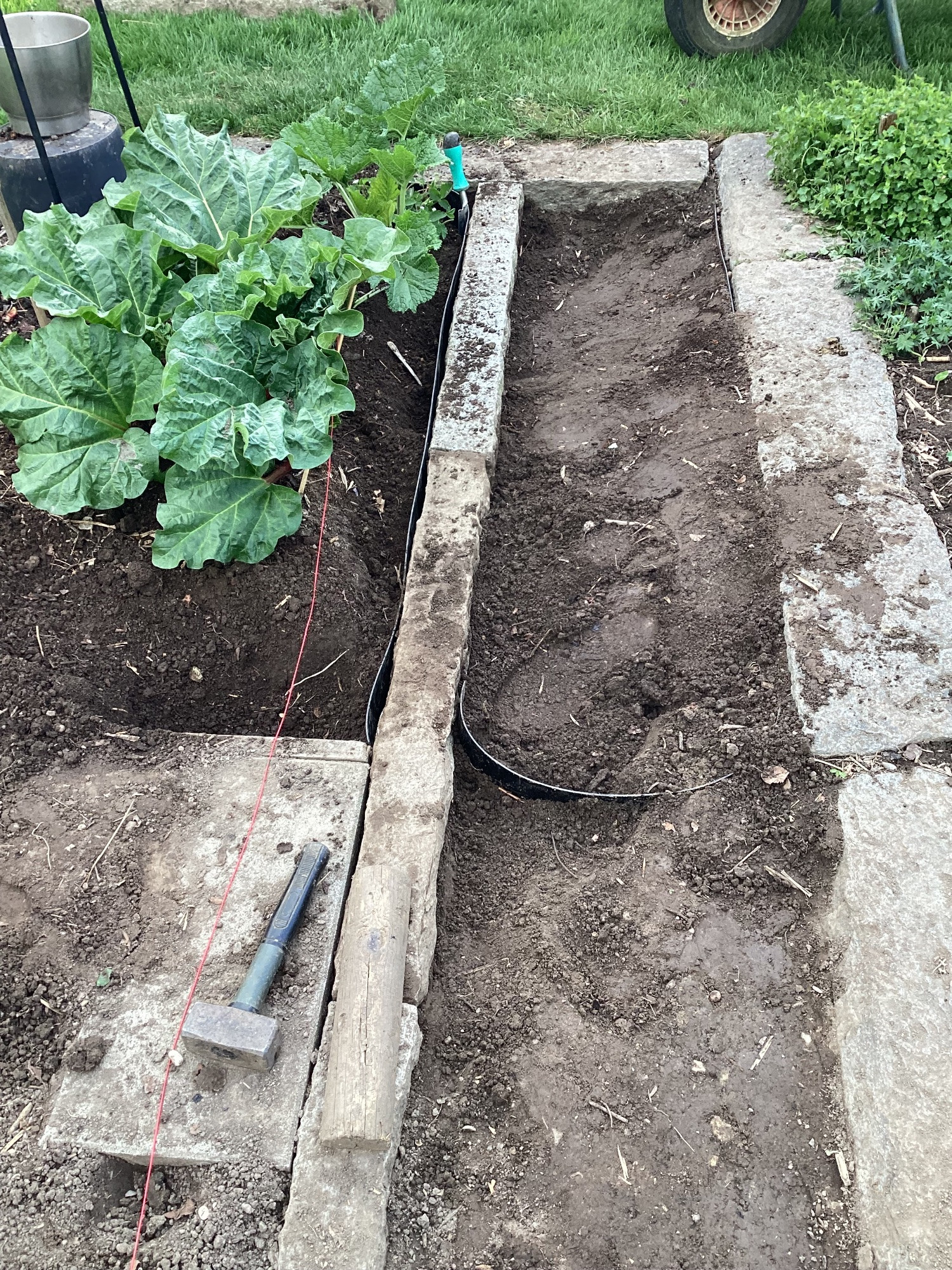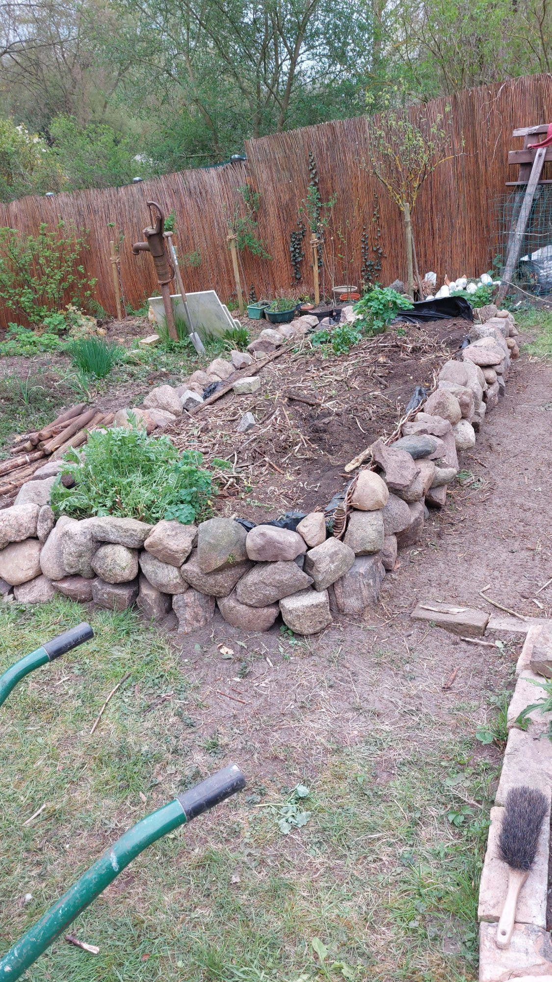 Ich habe gestern (mit Hilfe) Feldsteine um mein Hochbeet gelegt, also um das leicht erhöhte Beet, in dem ich immer die Gurken ziehe. Das kam mal aus der Not, weil der Boden dort schon von den Ulmenwurzeln aus Nachbarsgarten durchzogen ist, und sich nicht mehr bearbeiten ließ...