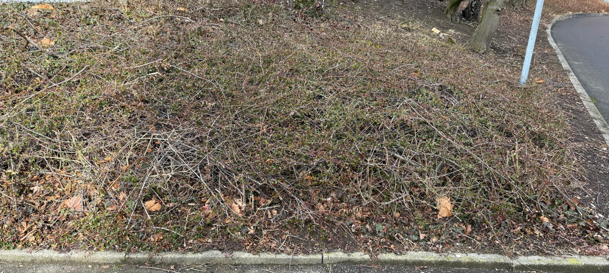 Es ist eine Böschung, der sich zwischen den Garageneinfahrt und Nachbargrundstück befindet. Bei starkem Regen ist da immer die Erde auf den Gehweg gebröselt. Daher terrassiere ich. Es war mit Cotoneaster bewachsen, in dem alles mögliche, wie Kratzbeeren, wilde Rosen usw. sich angesiedelt haben. Die meterlange Ranken wuchsen auf den Gehweg und mussten mehrmals im Sommer geschnitten werden.