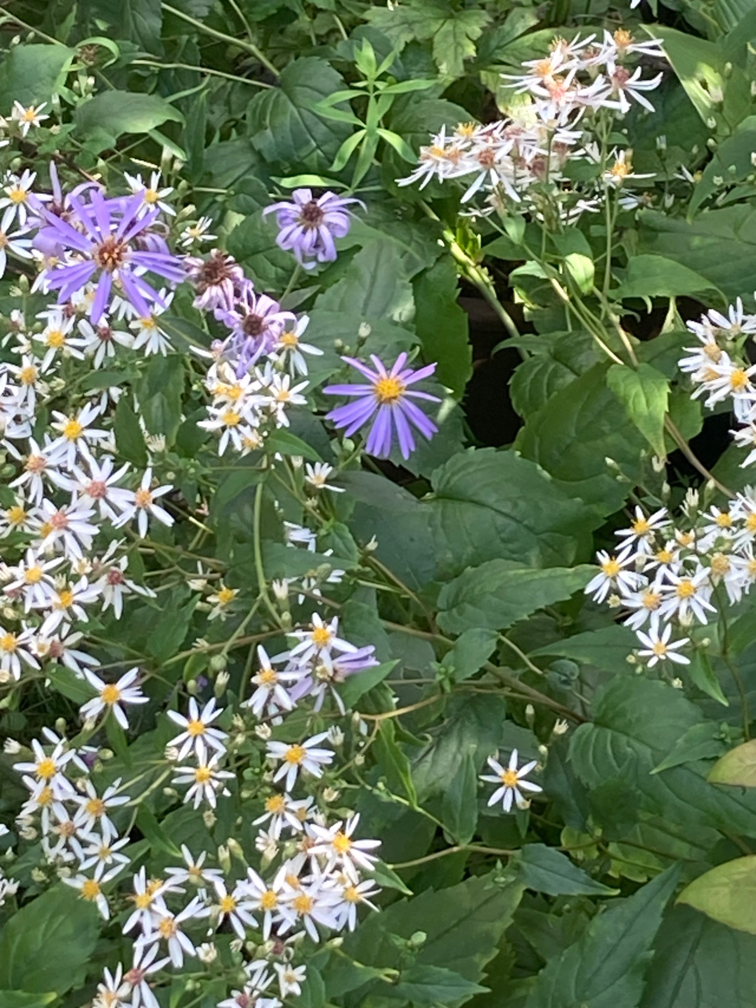 Ein Teil der Seseli verblüht nach Wochen, Mirabilis blüht jetzt durch und die Schatten-Herbstastern sind gleichzeitig da - Twilight mit deutlich kürzerer Blüte als divaricatus