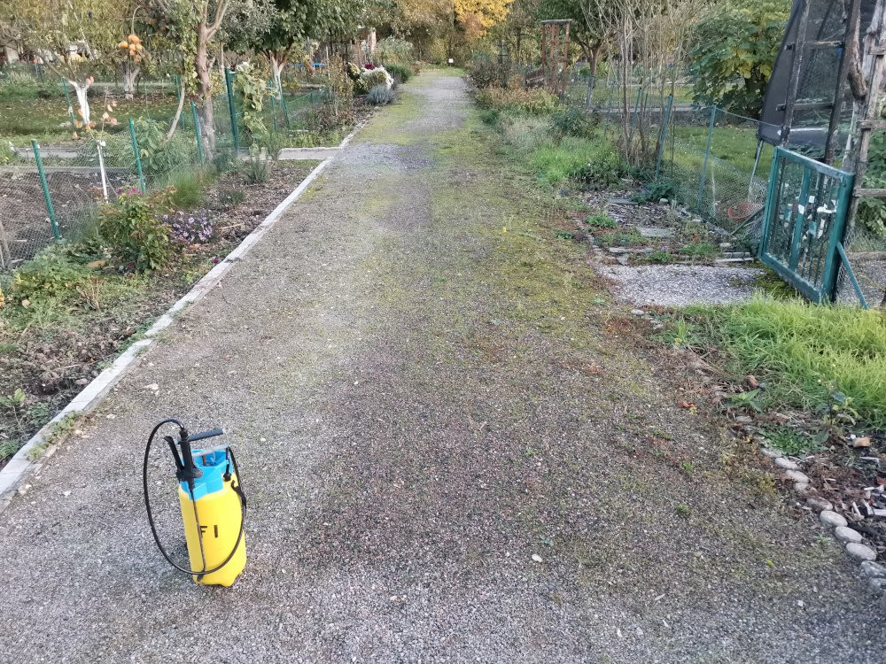 Gedüngt wurde das Unkraut (hauptsächlich Poa annua, einjähriges Rispengras) mit einer Lösung von 1300g Harnstoff in 4 Litern Wasser gelöst (32,5%, AdBlue Konzentration), davon wurden etwa 300ml auf die behandelte Fläche auf dem Bild gesprüht. Das macht rund 35g Reinstickstoff.