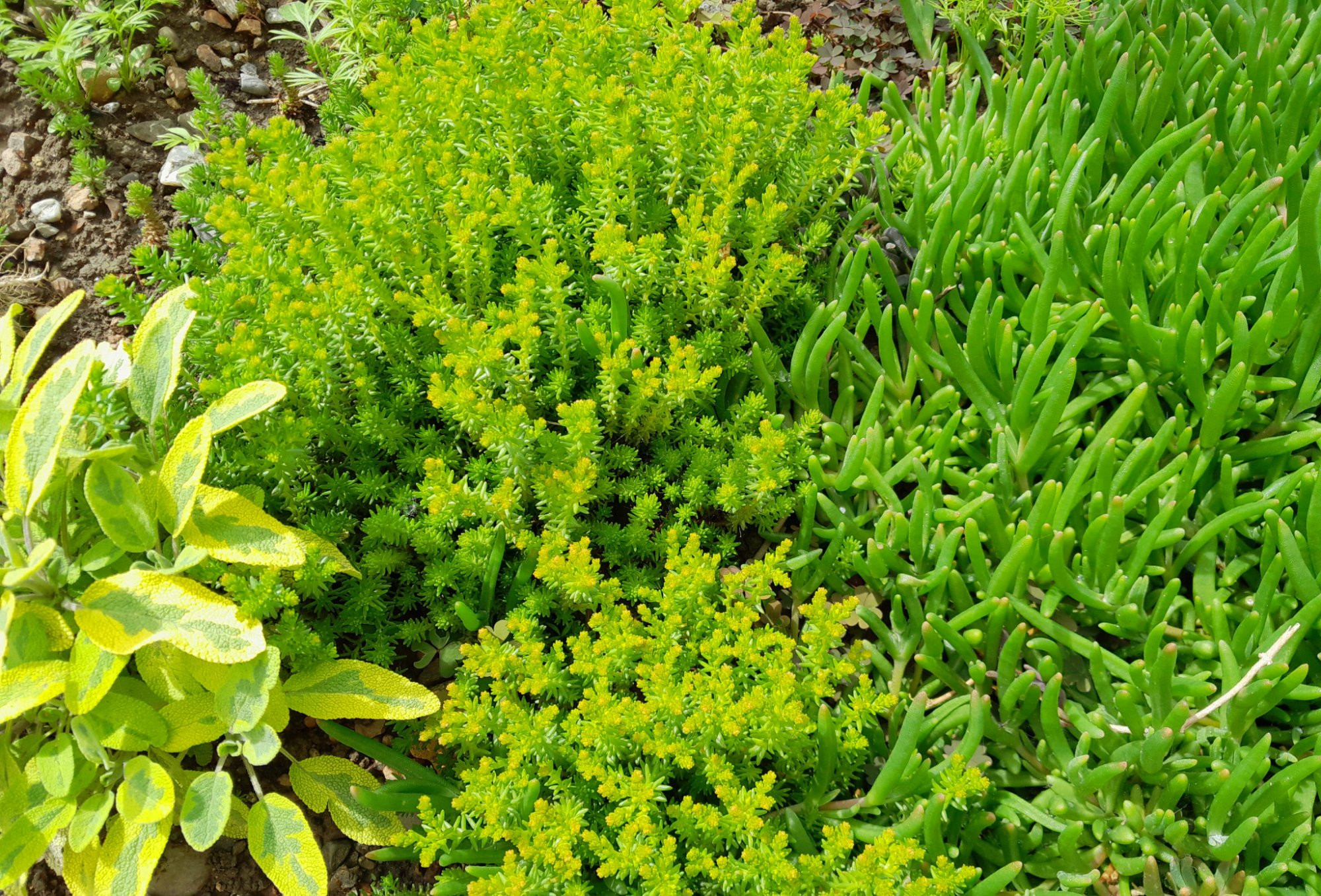 Panaschierter Gewürz-Salbei, Sedum acre, Delosperma cooperi irgendeine Sorte.