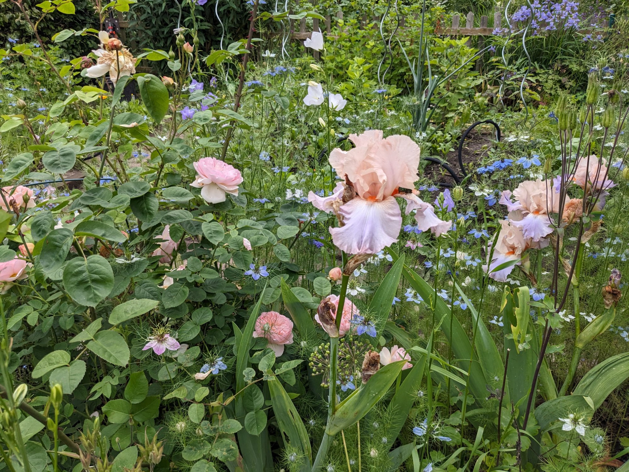 Rose mit Iris, Nigella, Akelei, Tomaten, Porree und Wasserschlauch