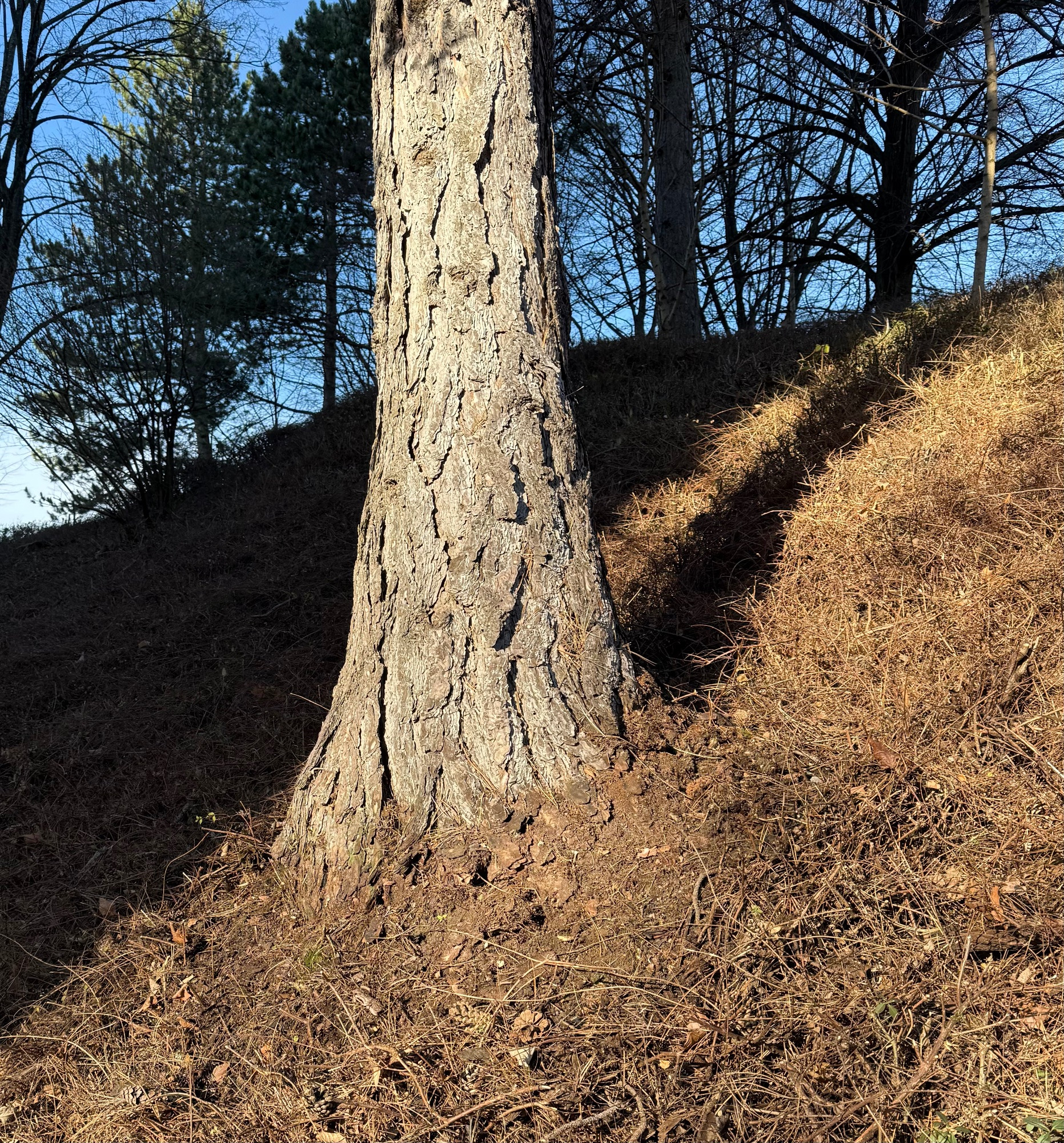 Ich habe heute in Mittagpause den Reisig weggeräumt und Kieferstamm frei geschnitten. Vorbeilaufende Nachbar hat mich übel beschimpft. Er meinte, wenn ich den Bodendecker um dem Baum wegschneide, dann kippt der Baum um