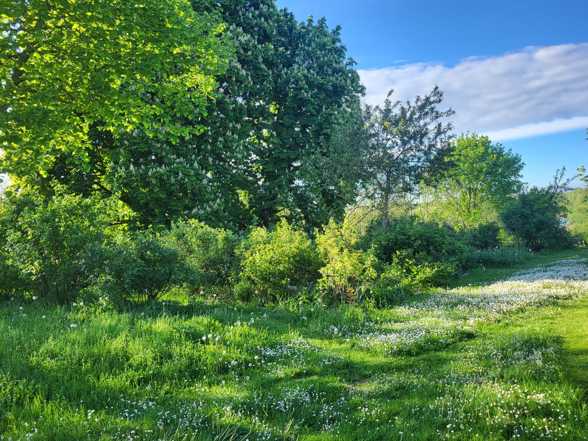Gras , Gänseblümchen, Zierapfel, Kastanie, Linde