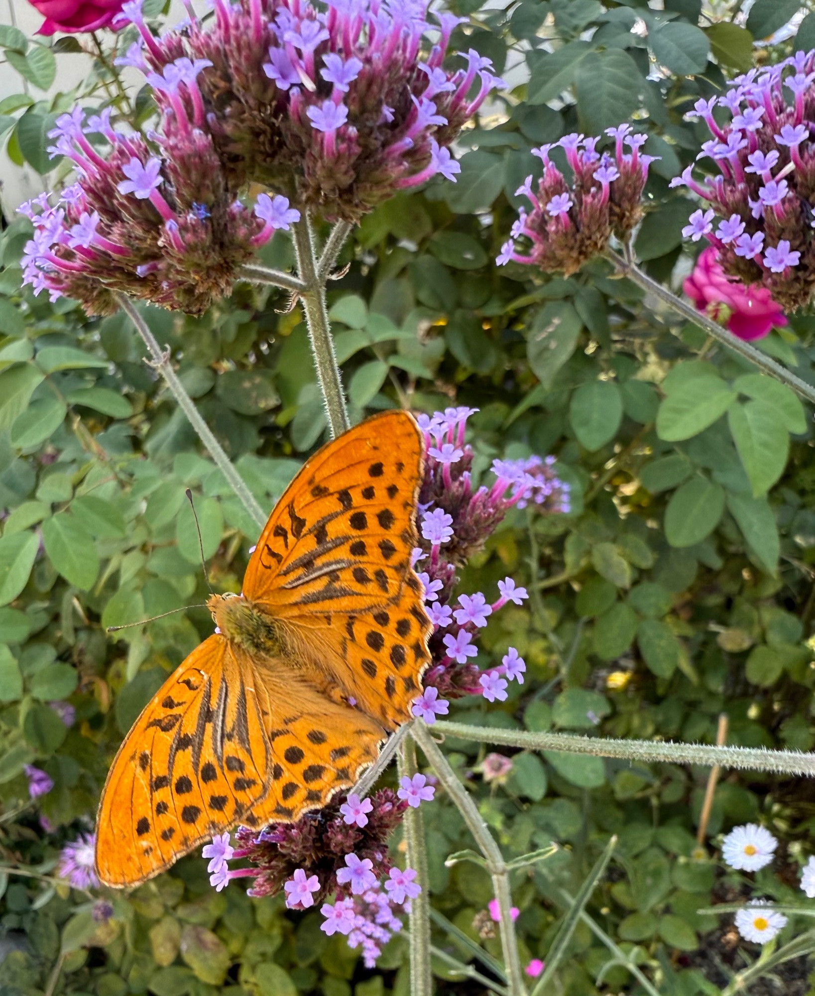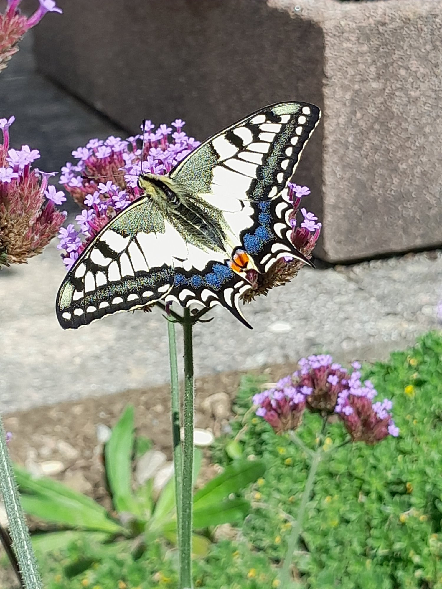 Verbena bonariensis und Schwalbenschwanz, im Hintergrund Natternkopf, Blaukissen, Betonplatten, Pflanzgefäß.