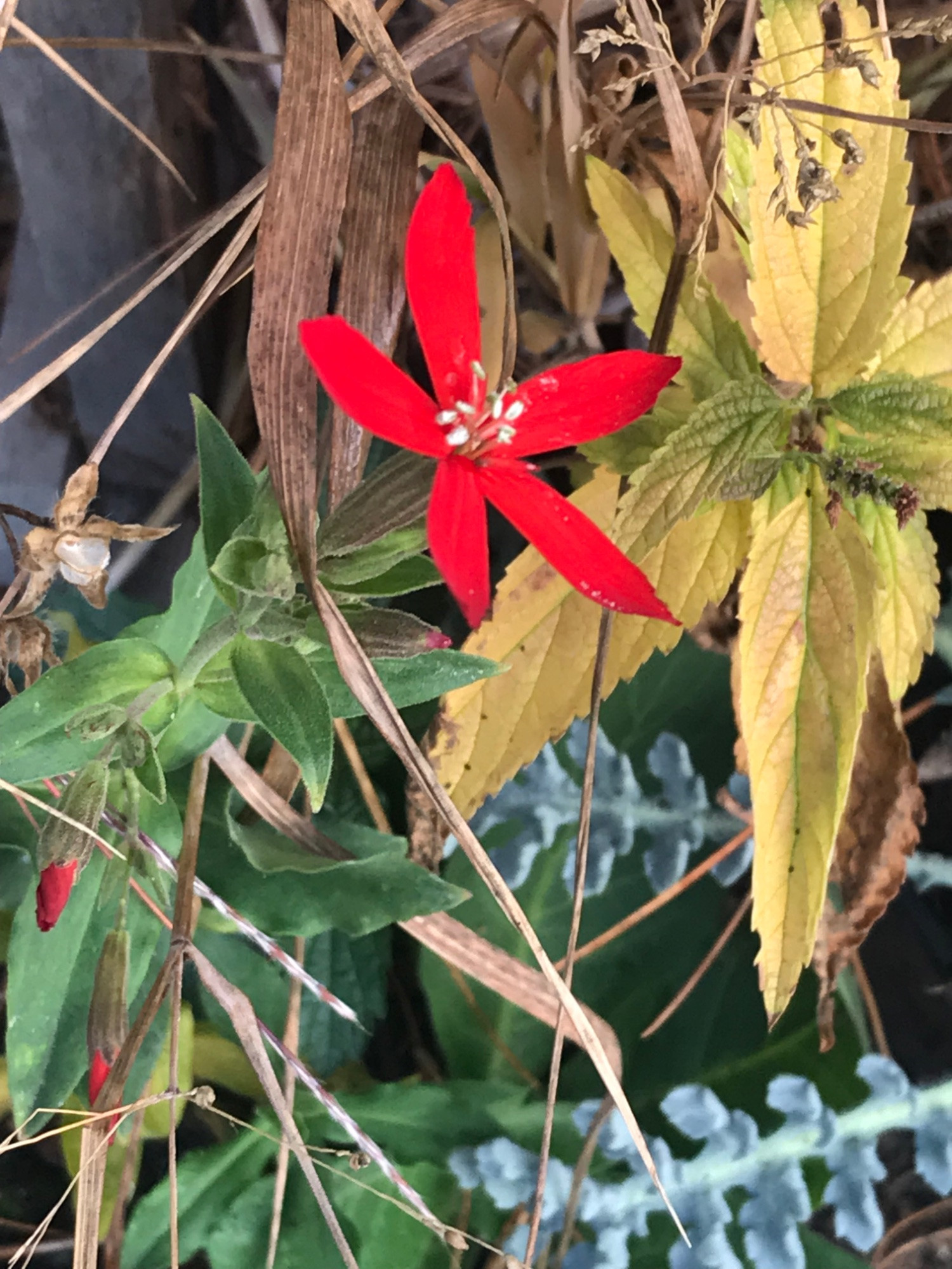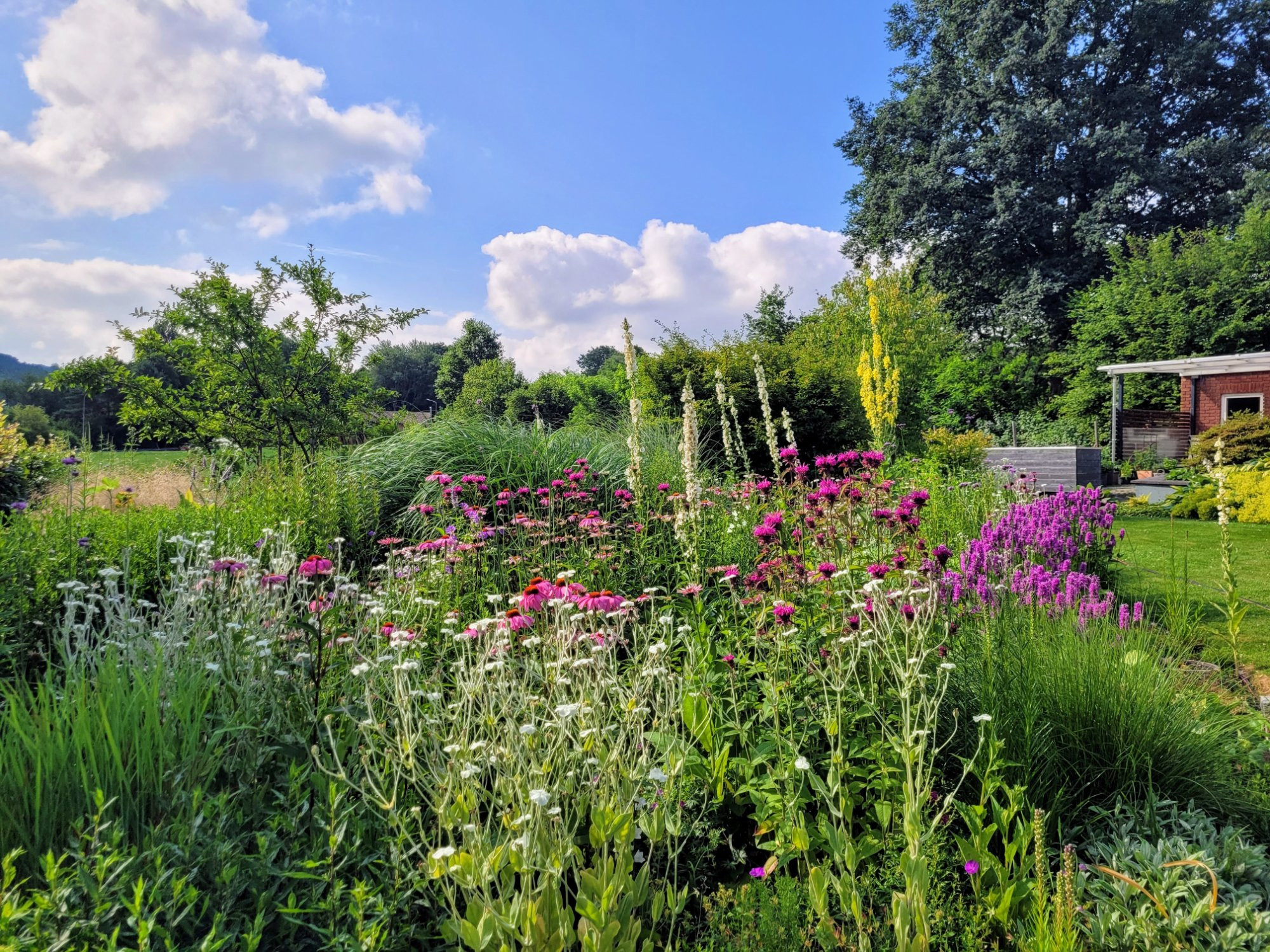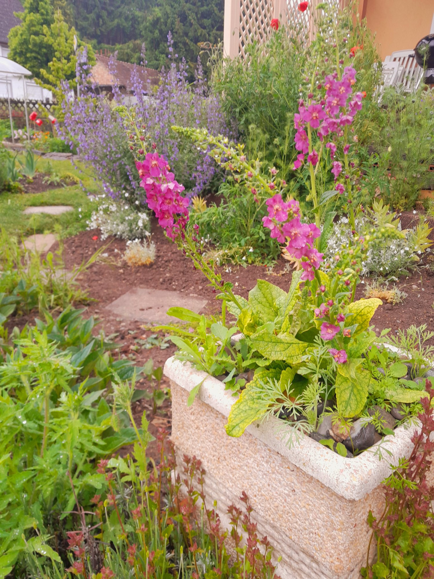 Katzenminze, Polsterglockenblumen, rosa Königskerze, Klatschmohn, Nigella damascena, und dingens, äh. Dieser wuchernde graulaubige Bodendecker mit weißen Blüten.