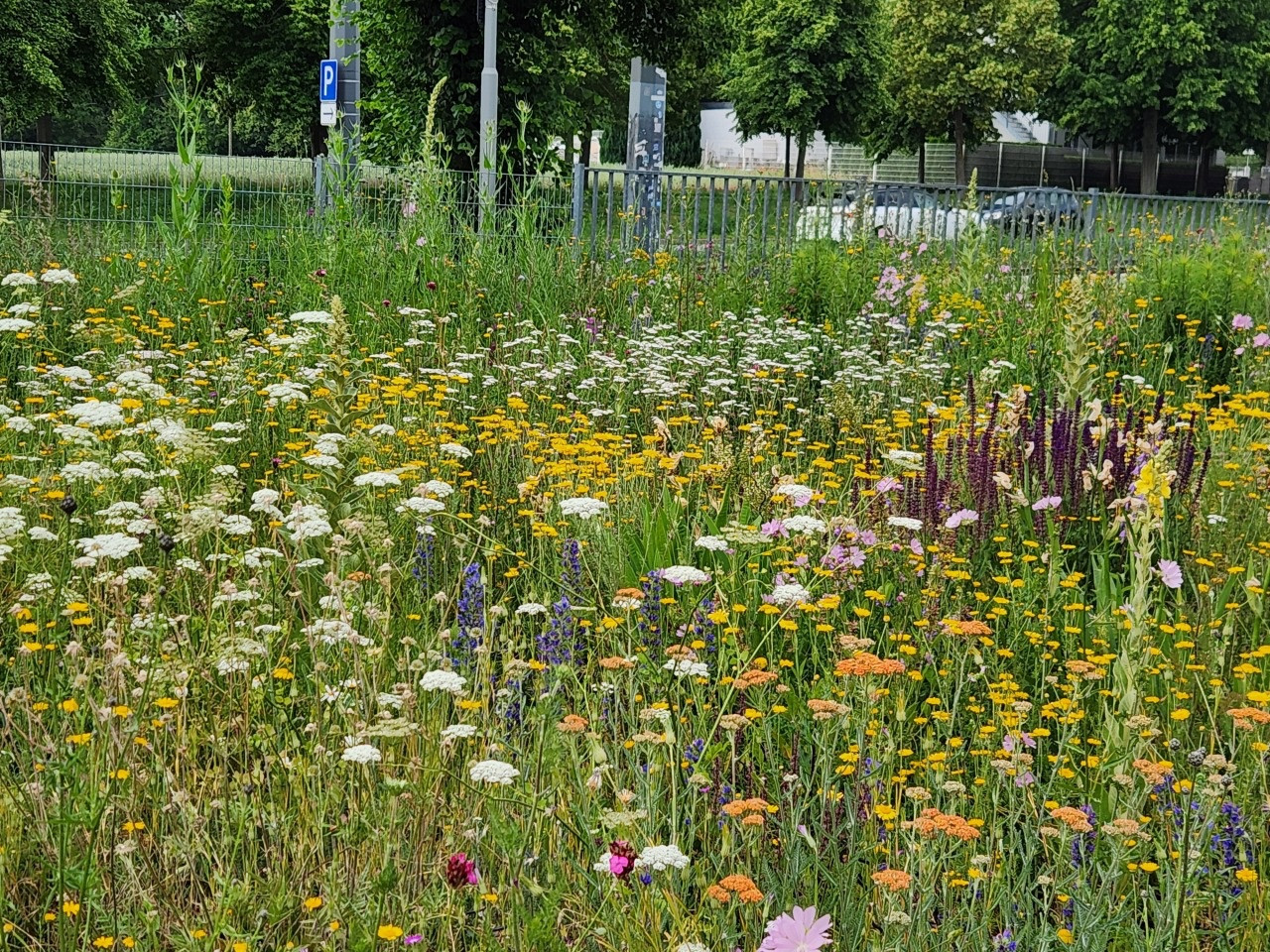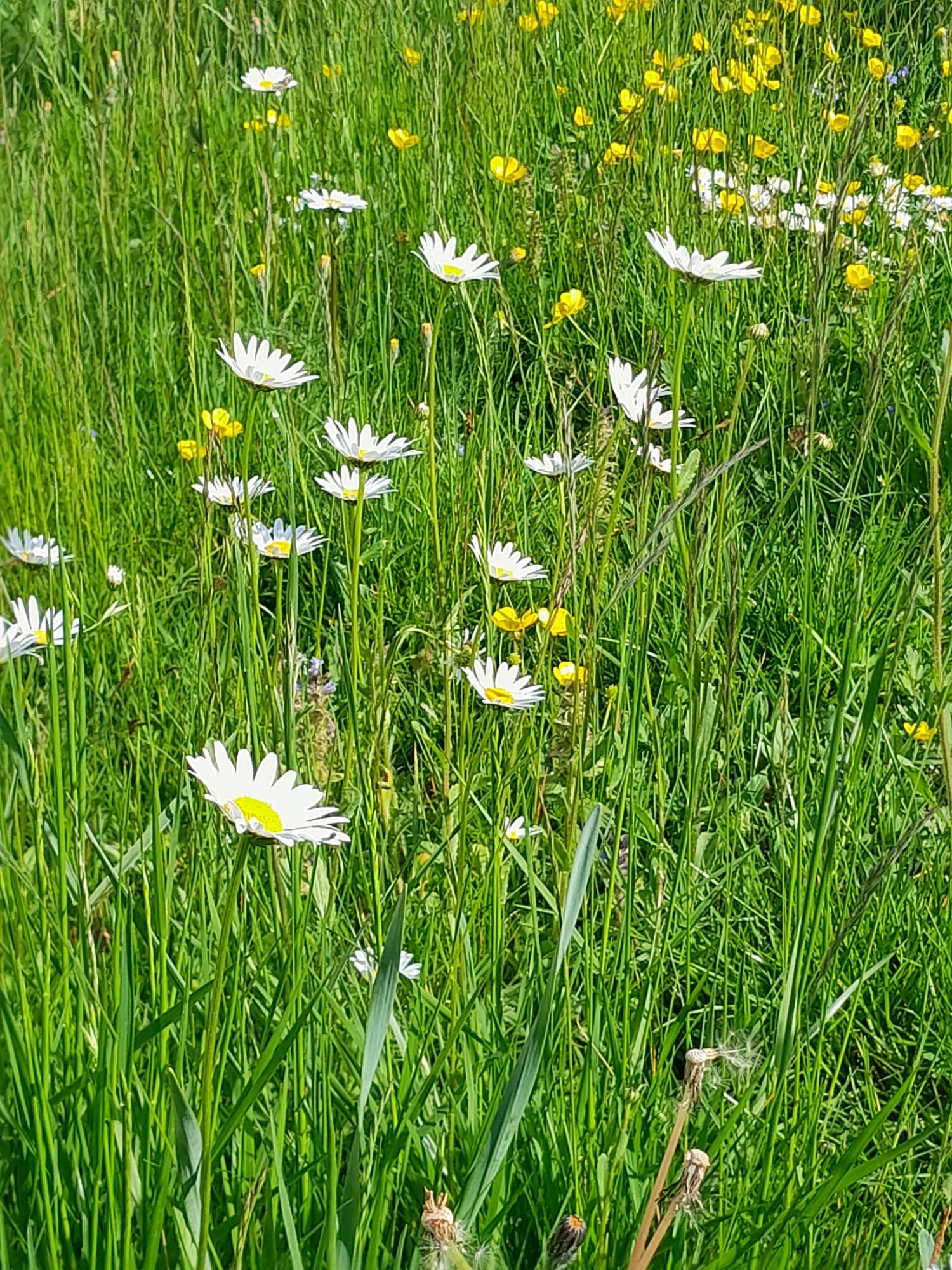 Wiesenmargariten, Hahnenfuß, Löwenzahn, Gänseblümchen weiter hinten.