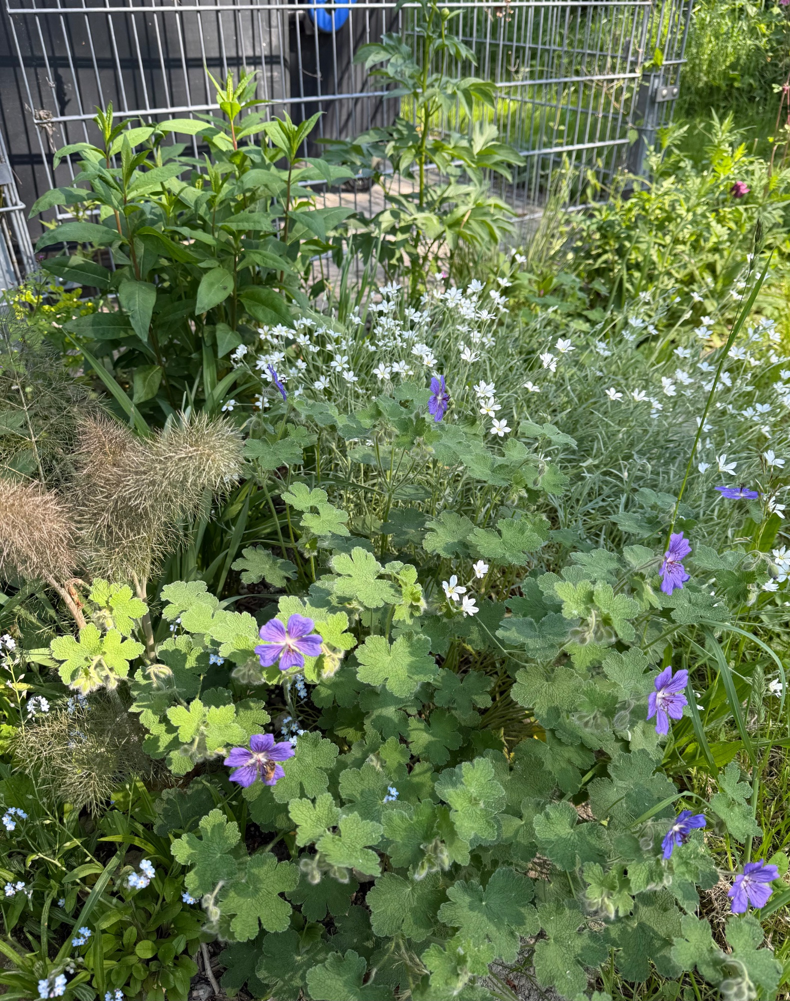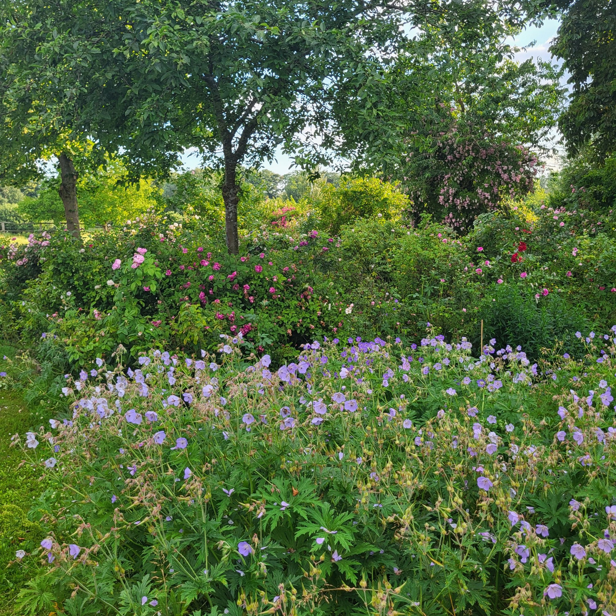 Den vordere Teil der sog. Rosenwiese hat der Wiesen-Storchschnabel übernommen.