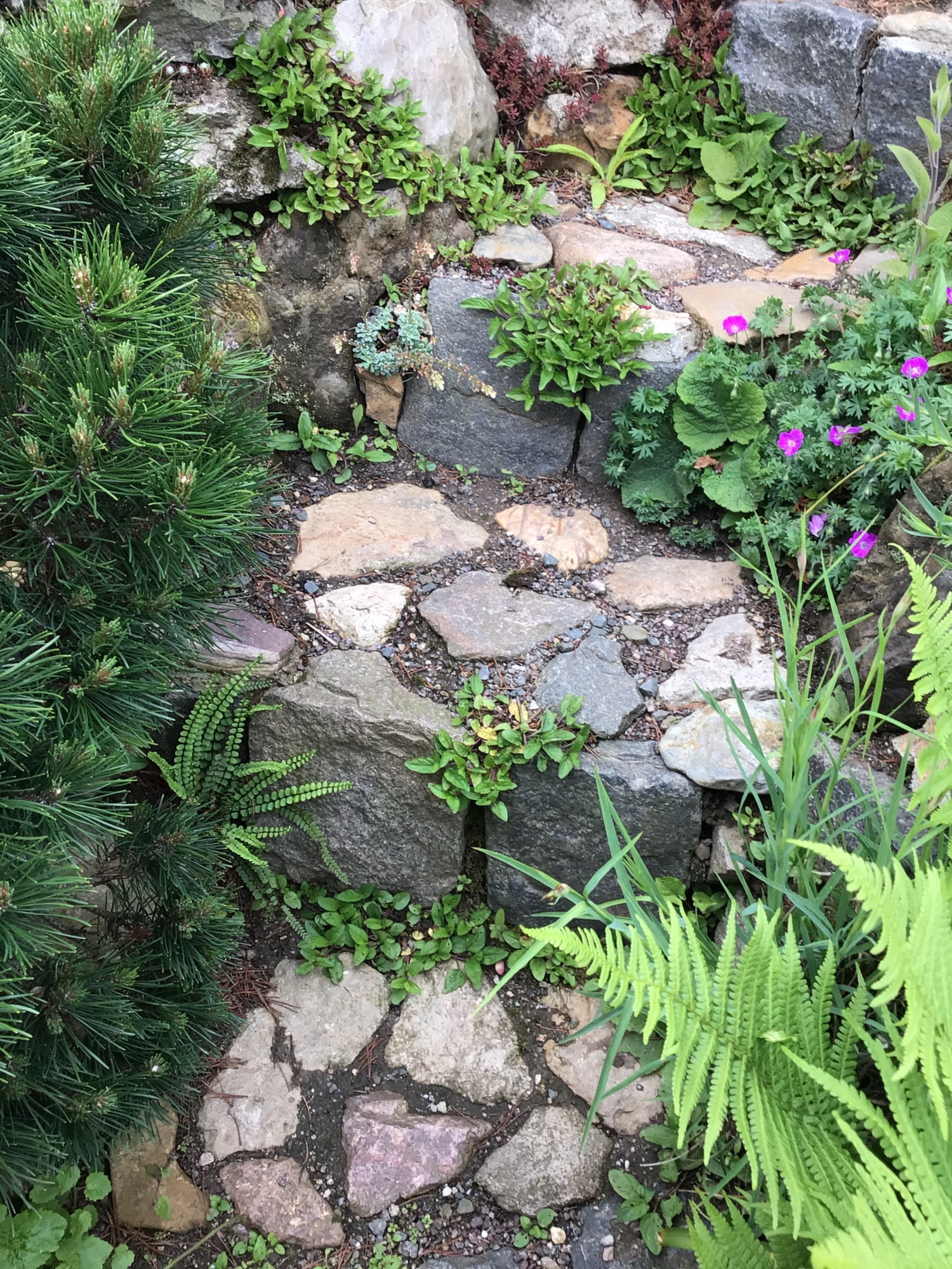 Ich lege an die Kiefer an (bei mir noch klein, vorne im Bild im Kiesbeet) und biete Choisya ternata, Eiben, Platanen, Efeu: