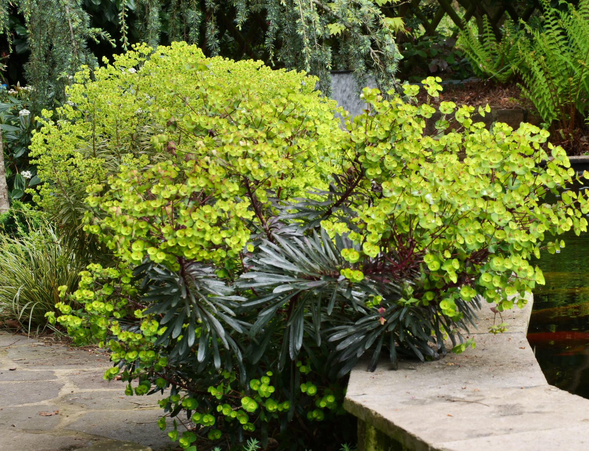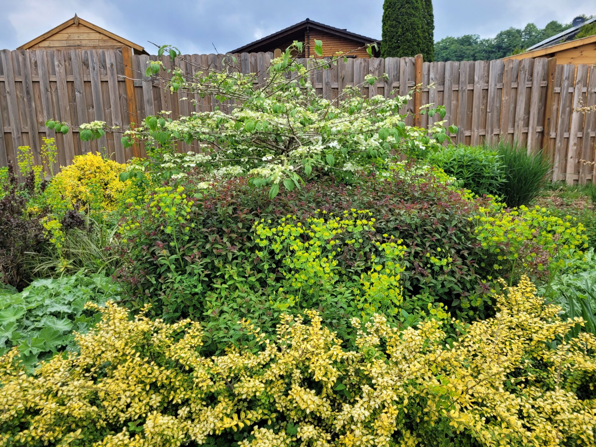 Euphorbia amygdaloides... mit Viburnum mariesii und Spiersträuchern, davor Ilex crenata 'Golden Gem'.