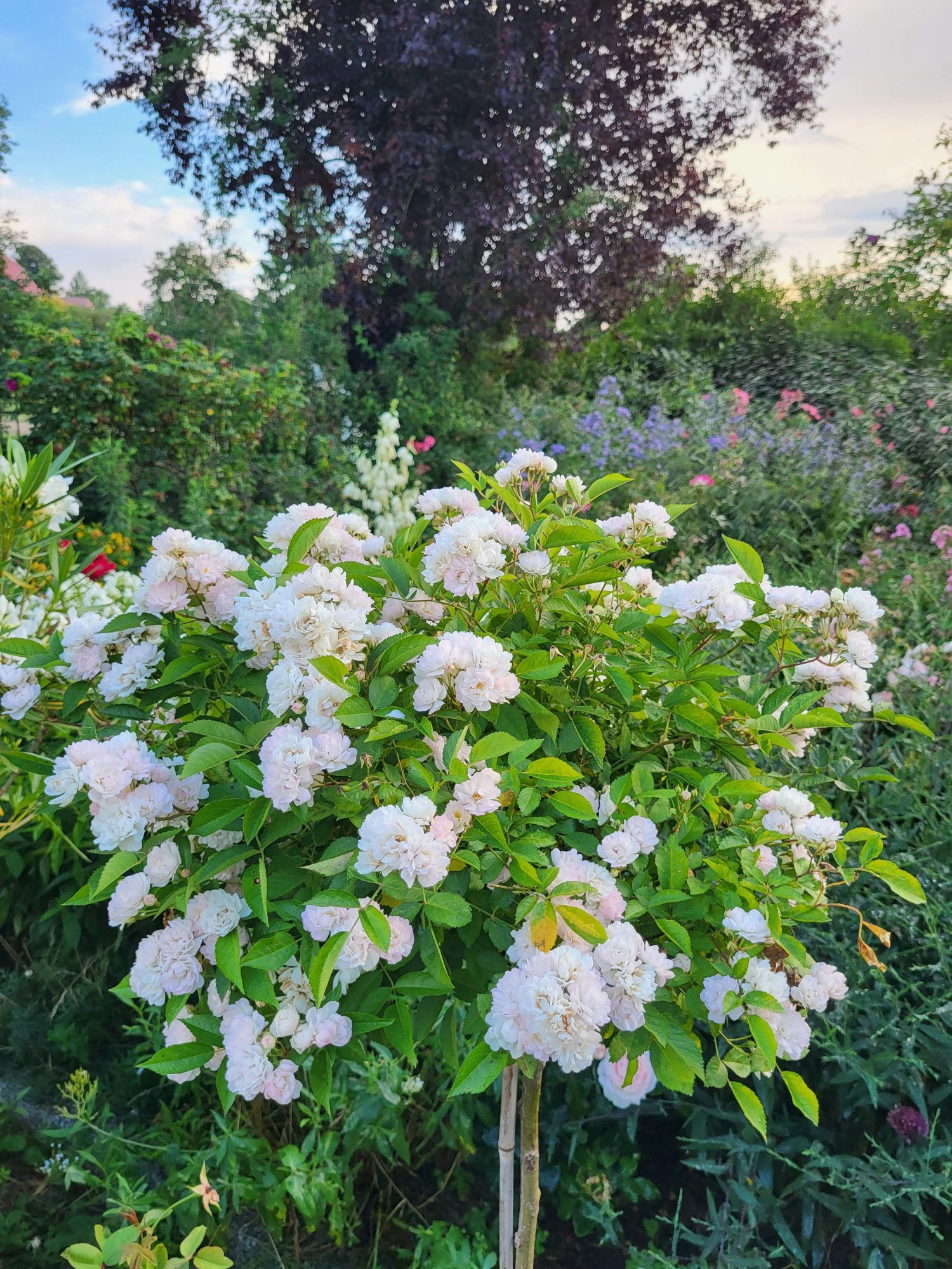 Campanula lactiflora im Hintergrund, Blutpflaume, Rosen, Yucca filamentosa und anderes