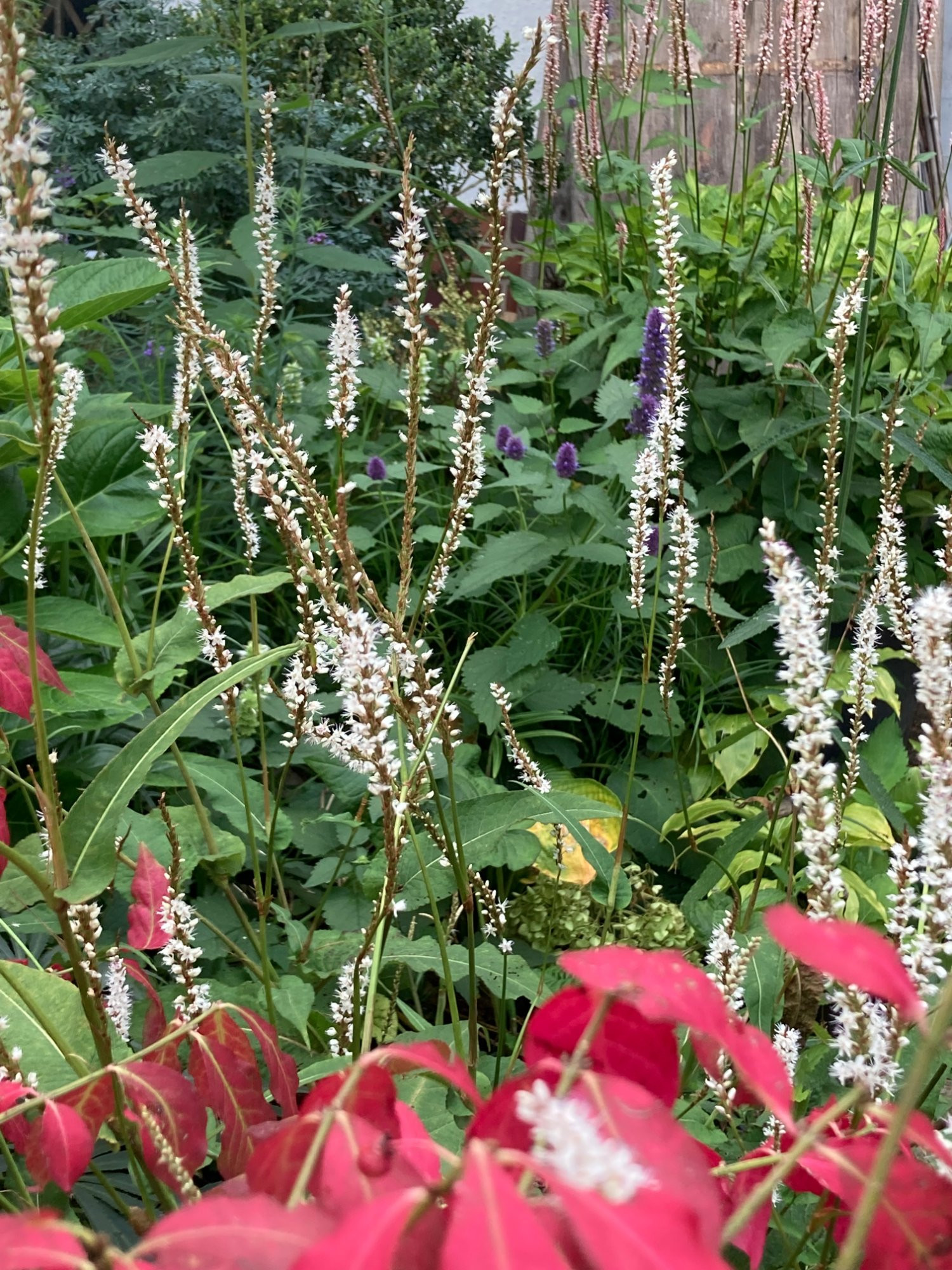 Das volle Mai-Programm in einem meiner ganz wenigen Sonnenbeete: Euphorbium epitymoides, Iris sibirica, Geum, Geranium, Akelei, Kartoffelrosen und ganz viel anderes Staudenlaub.