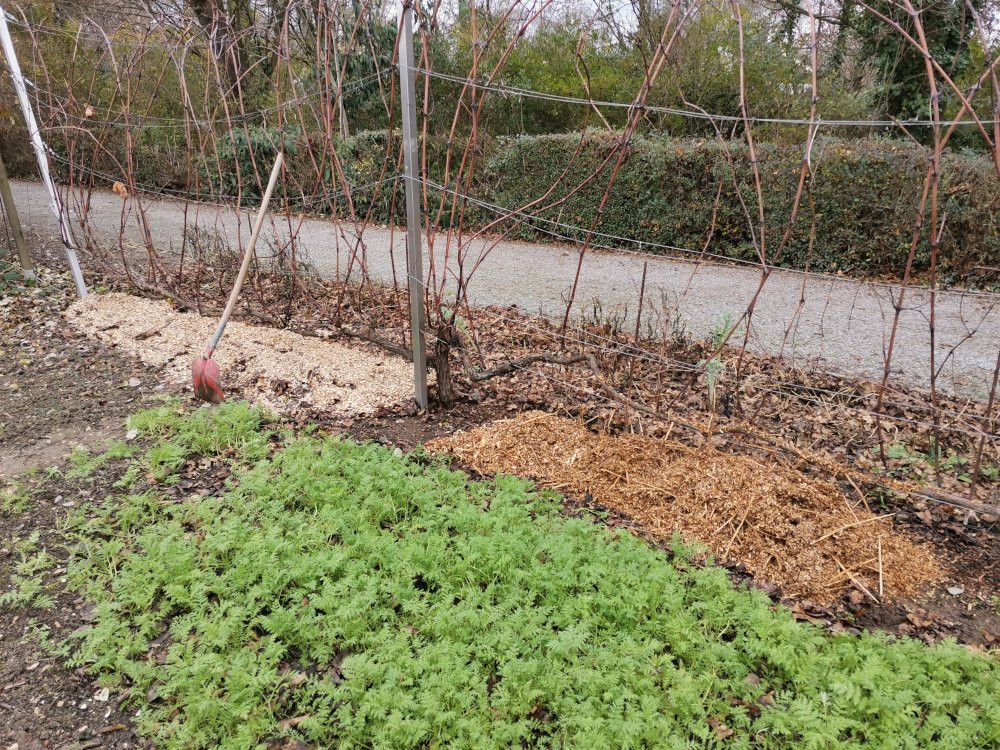 Heute jedenfalls im Nachbargarten den Stapel von der Hecke die Woche weggehäckselt und unter den Reben dort verteilt.