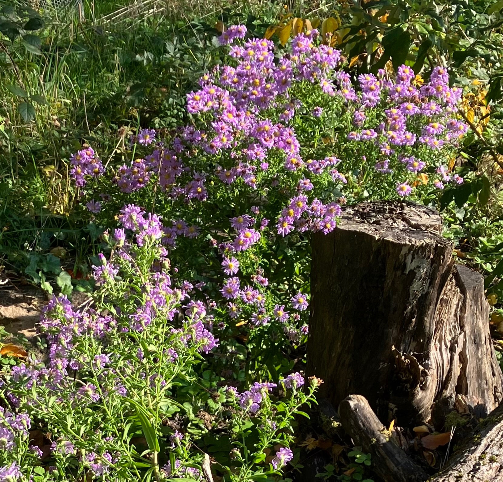 Aster, Totholz, Wiese, rechts oben ein bisschen Ölweide.
