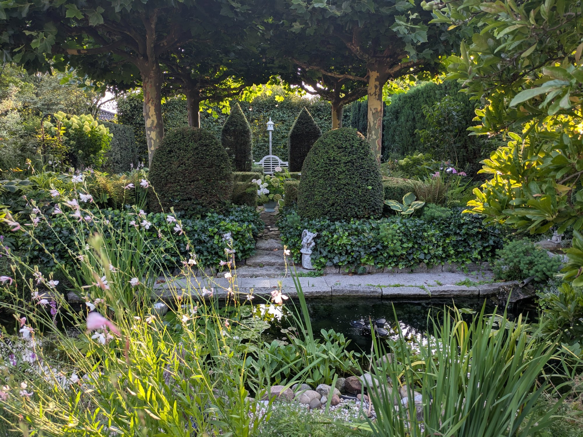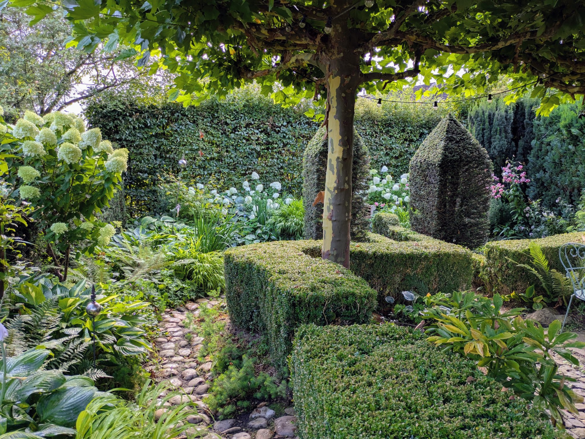 Ich lege an die frisch geschnittenen Hecken im Hintergrund an und biete Buchs, Hainbuche und Eibe.
