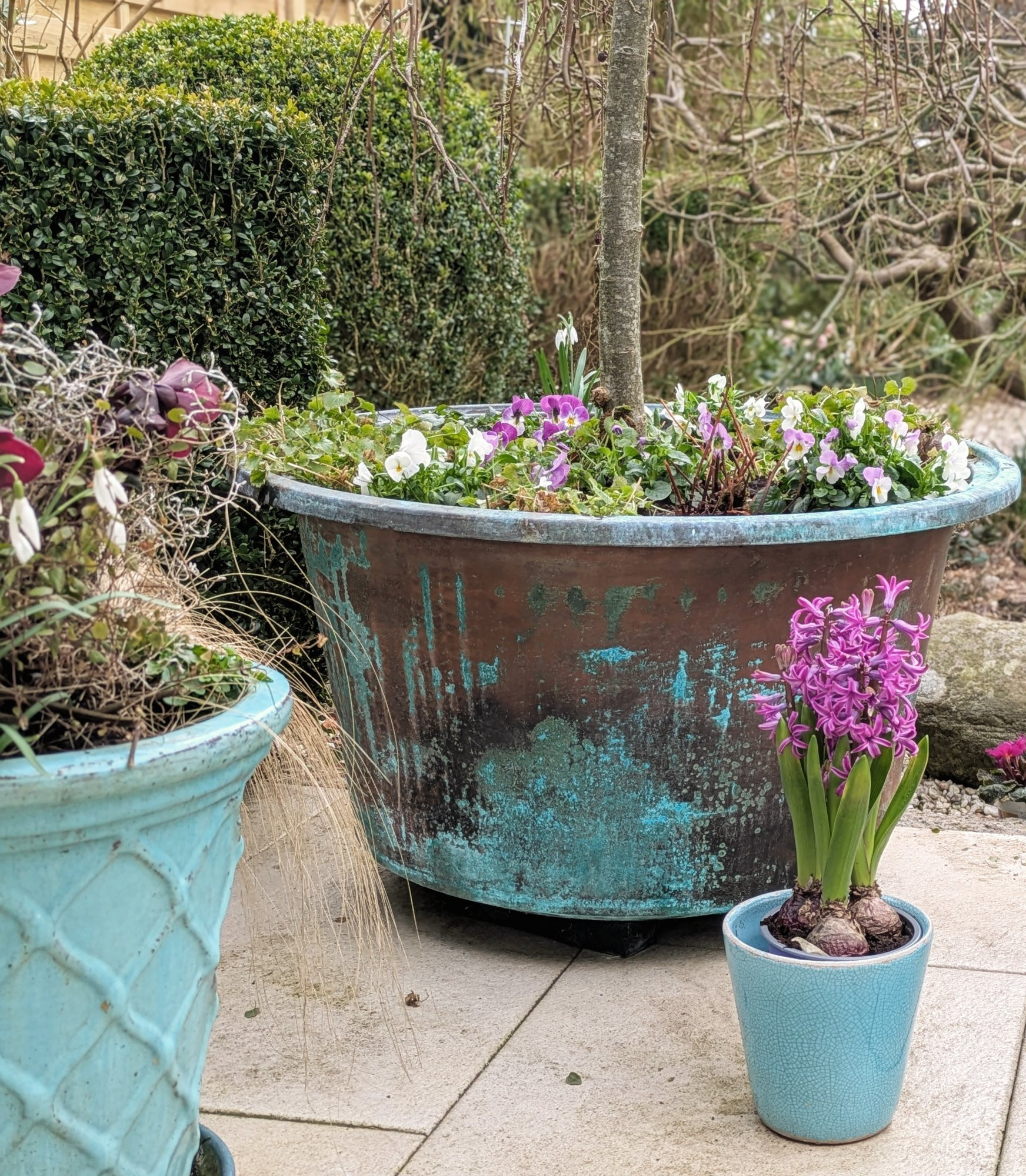 Und biete Hyazinthen und Hornveilchen, Helleborus und Buchs.